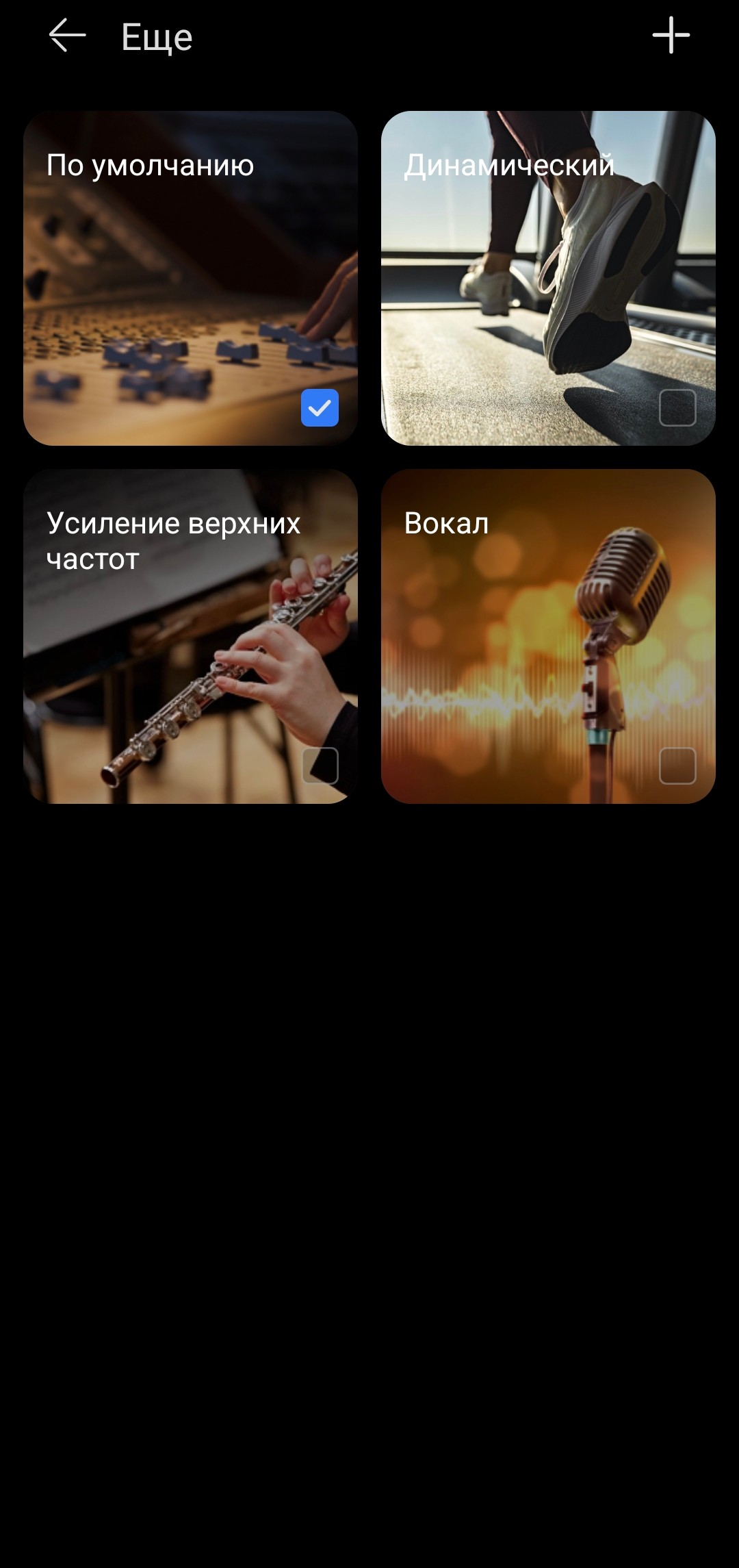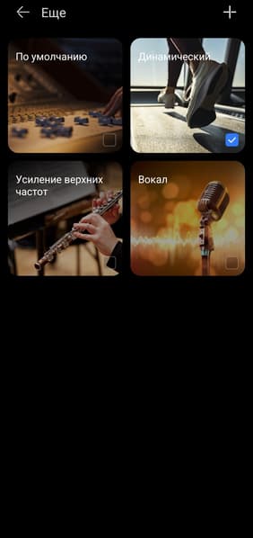 Посмотрим, как работают пресеты эквалайзера. «Усиление ВЧ» усиливает верхние частоты, «Вокал» поднимает середину. Ну а «Динамический» — делает дополнительный акцент на басе. В англоязычной версии приложения он называется «Elevate» — повышение, что немного лучше отражает его суть.