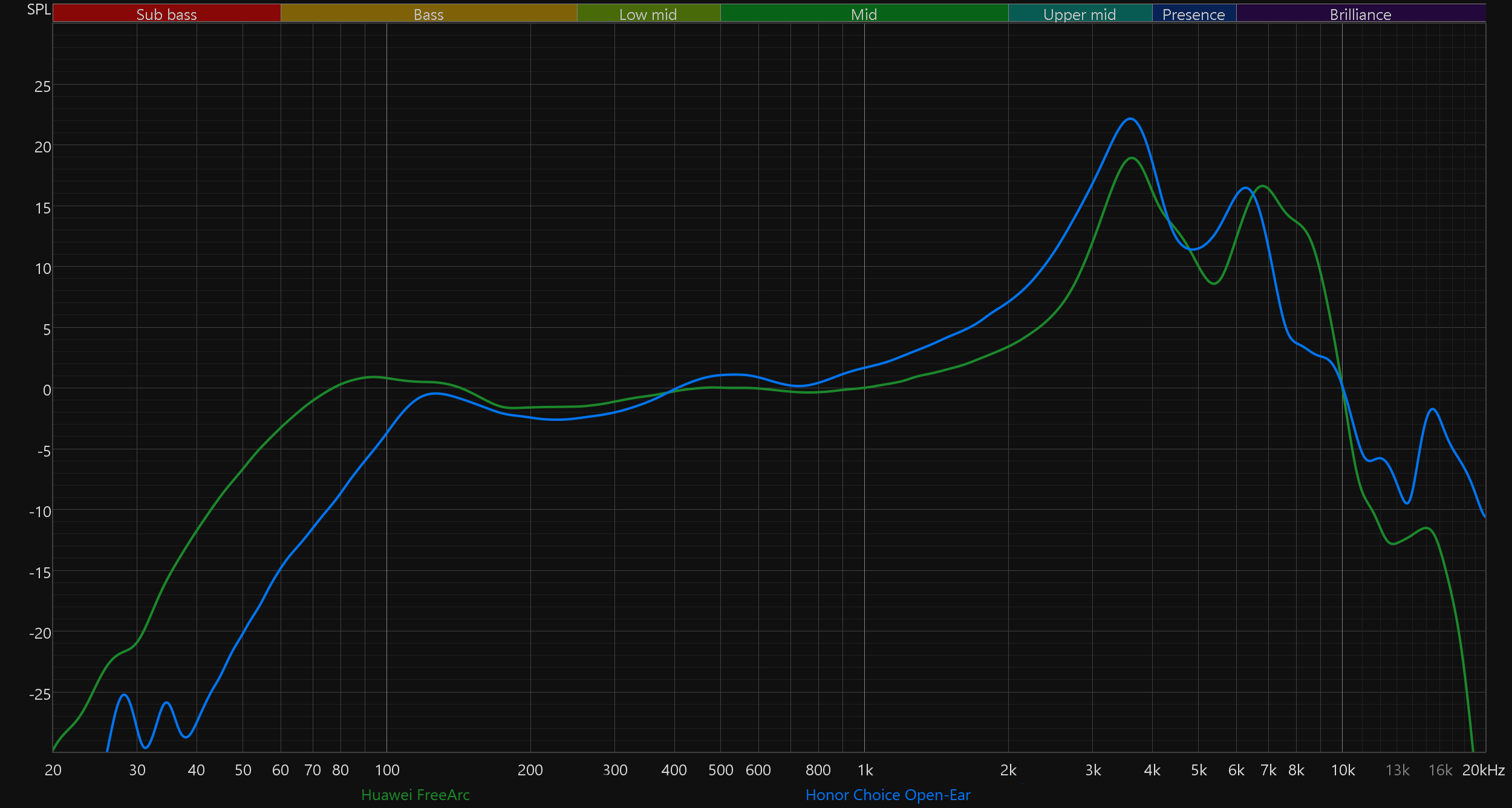 Сравним графики Huawei FreeArc и протестированной в прошлом году Honor Choice Open-Ear. Обе гарнитуры мы заслуженно похвалили, но FreeArc тут явно выигрывает за счет полновесного НЧ-регистра — есть повод заплатить немного побольше и выбрать именно ее.