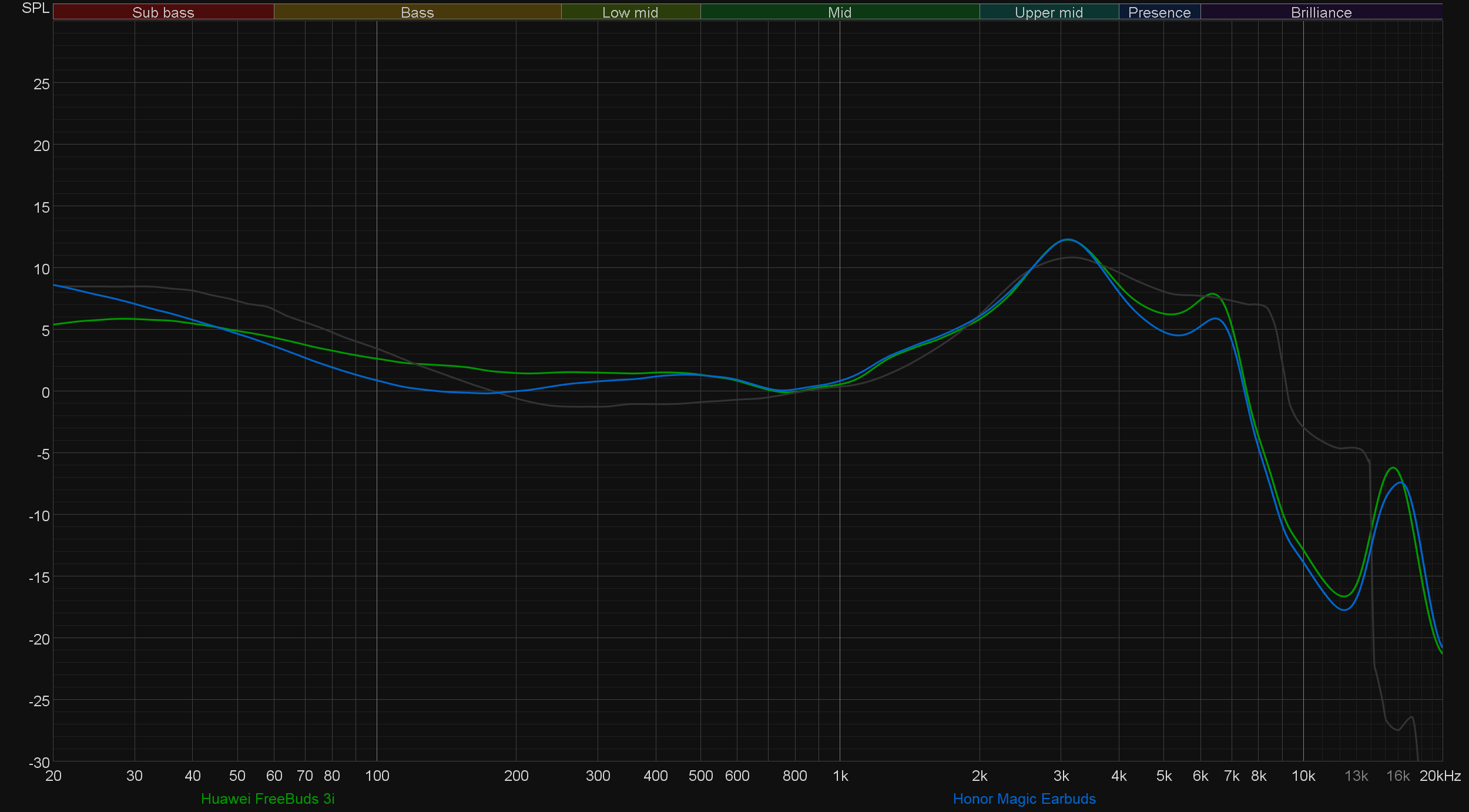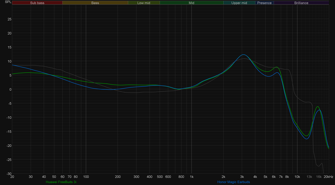 По звуку Huawei Freebuds 3i практически не отличается от Honor Magic Earbuds. Для своего форм-фактора и ценового сегмента обе демонстрируют на удивление приятное и сбалансированное звучание. Небольшое «бубнение» в НЧ и слегка излишне акцентированную верхнюю середину им вполне можно и простить. Схожесть звучания прекрасно видна и на графиках АЧХ — разница есть, но она минимальна. На столь малые отличия вполне можно «закрыть глаза», учитывая невозможность обеспечить абсолютно одинаковое положение наушников на стенде.