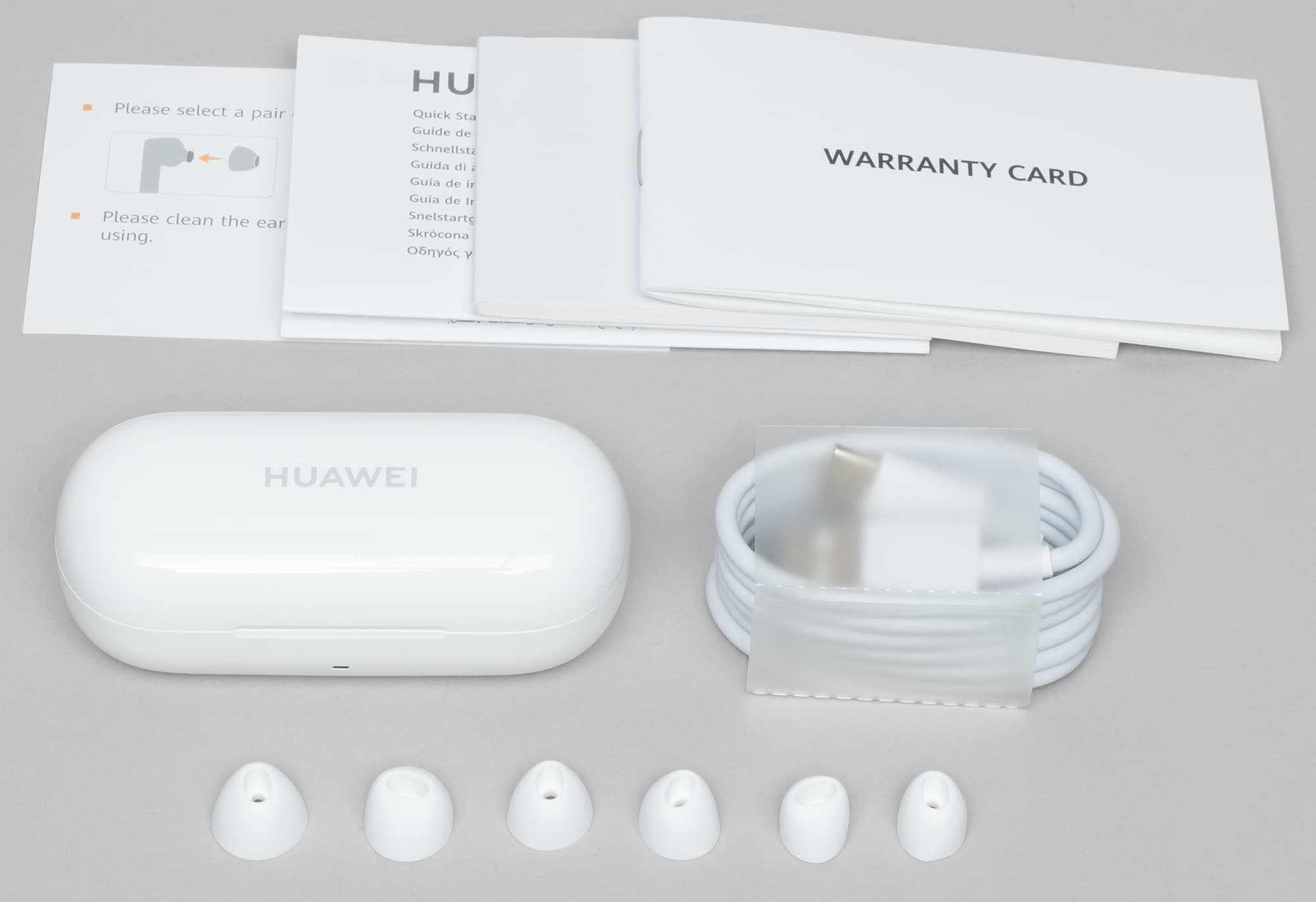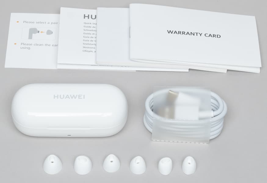 В комплект поставки входят документация, кабель USB Type-C длиной 1 метр, три пары сменных амбушюров, сами наушники в кейсе для зарядки и переноски.
