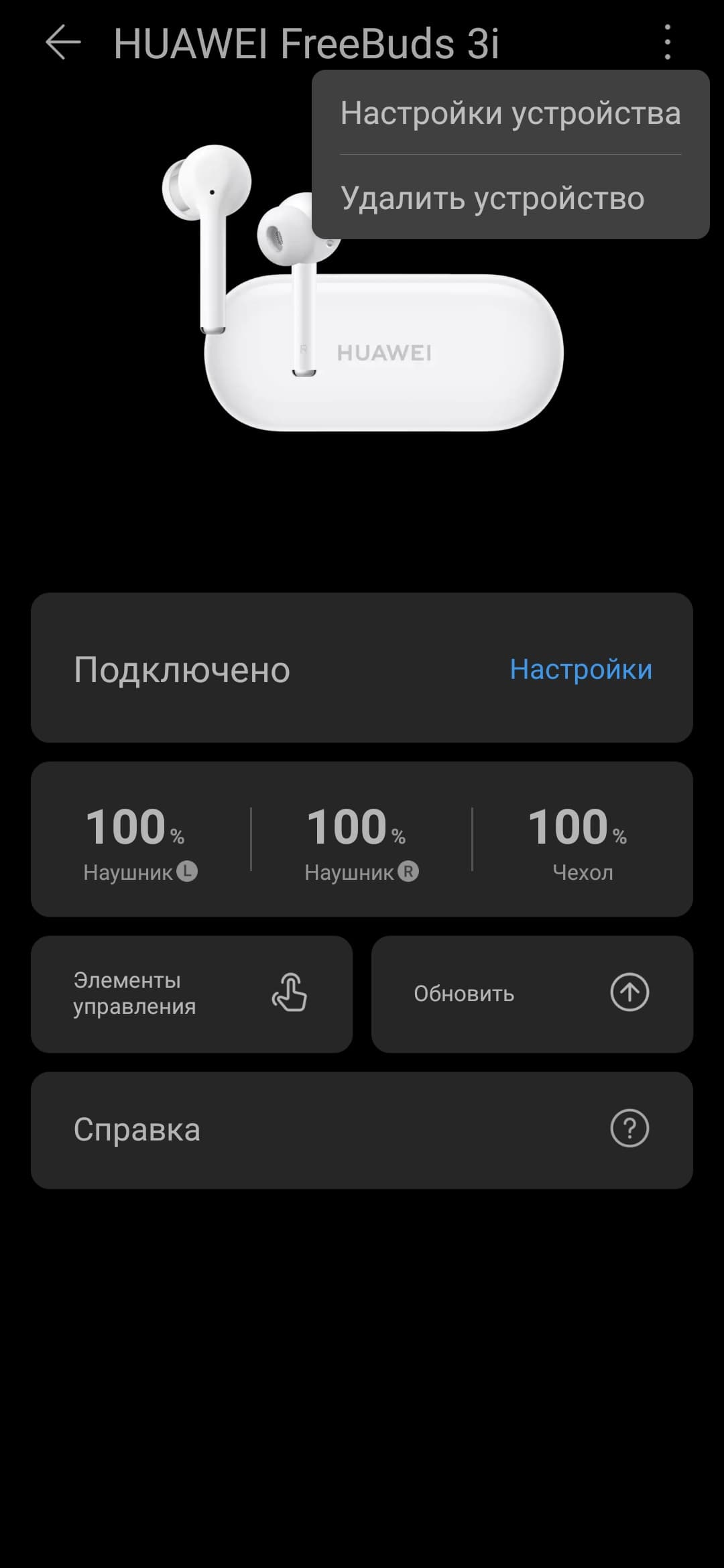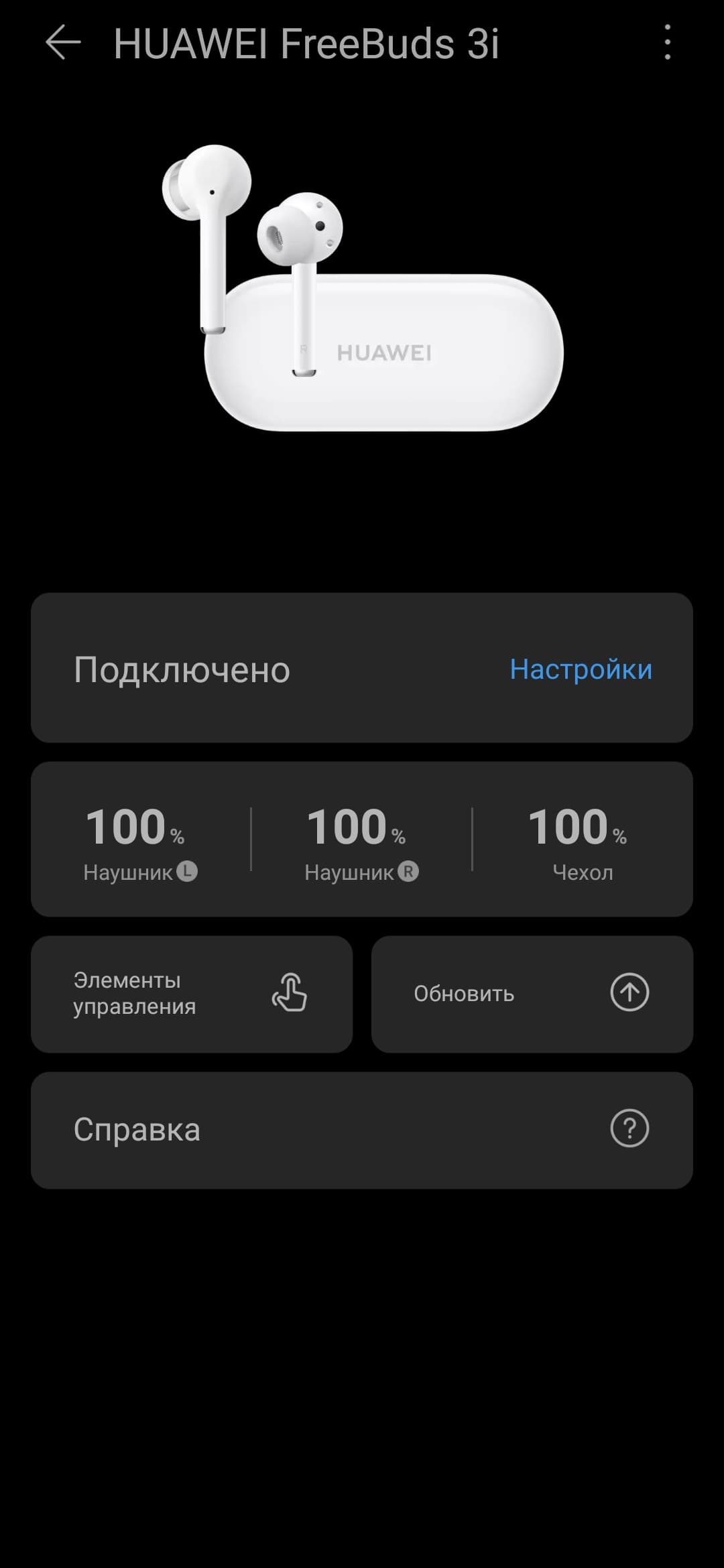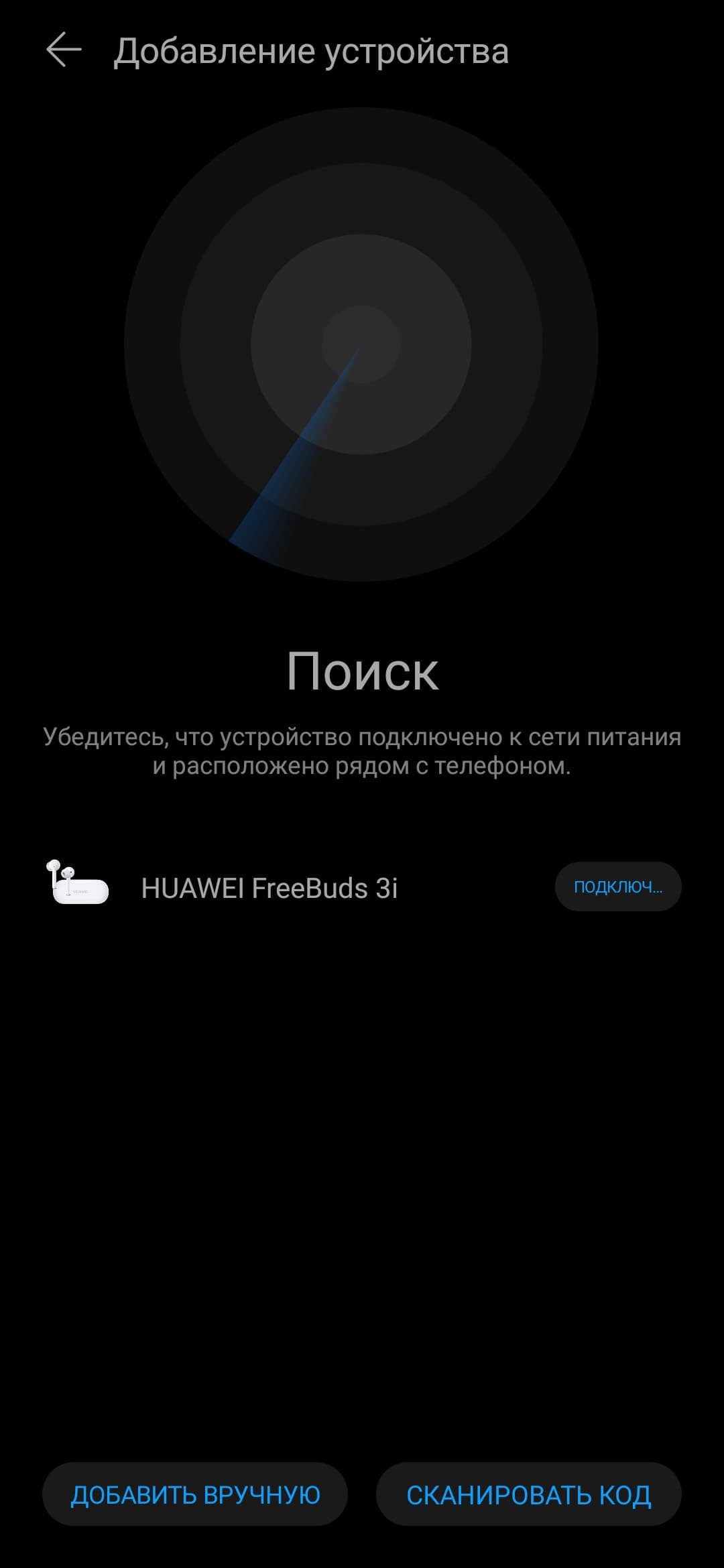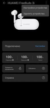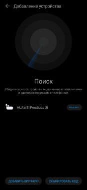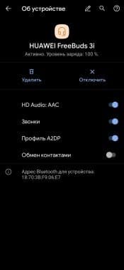 Подключить гарнитуру можно прямо из приложения, нажав «+» на главном экране. Доступна для обнаружения Huawei FreeBuds 3i после открытия кейса и нажатия на кнопку возле порта для зарядки в течение примерно 3 секунд — вынимать наушники не нужно. Поиск занимает всего пару секунд, остается нажать на кнопку подключения и ответить согласием на запрос, появляющийся в виде уведомления. Далее устройство отображается на домашней вкладке приложения, прямо из которой можно перейти на страницу его настройки и проверить, что по умолчанию используется кодек AAC.