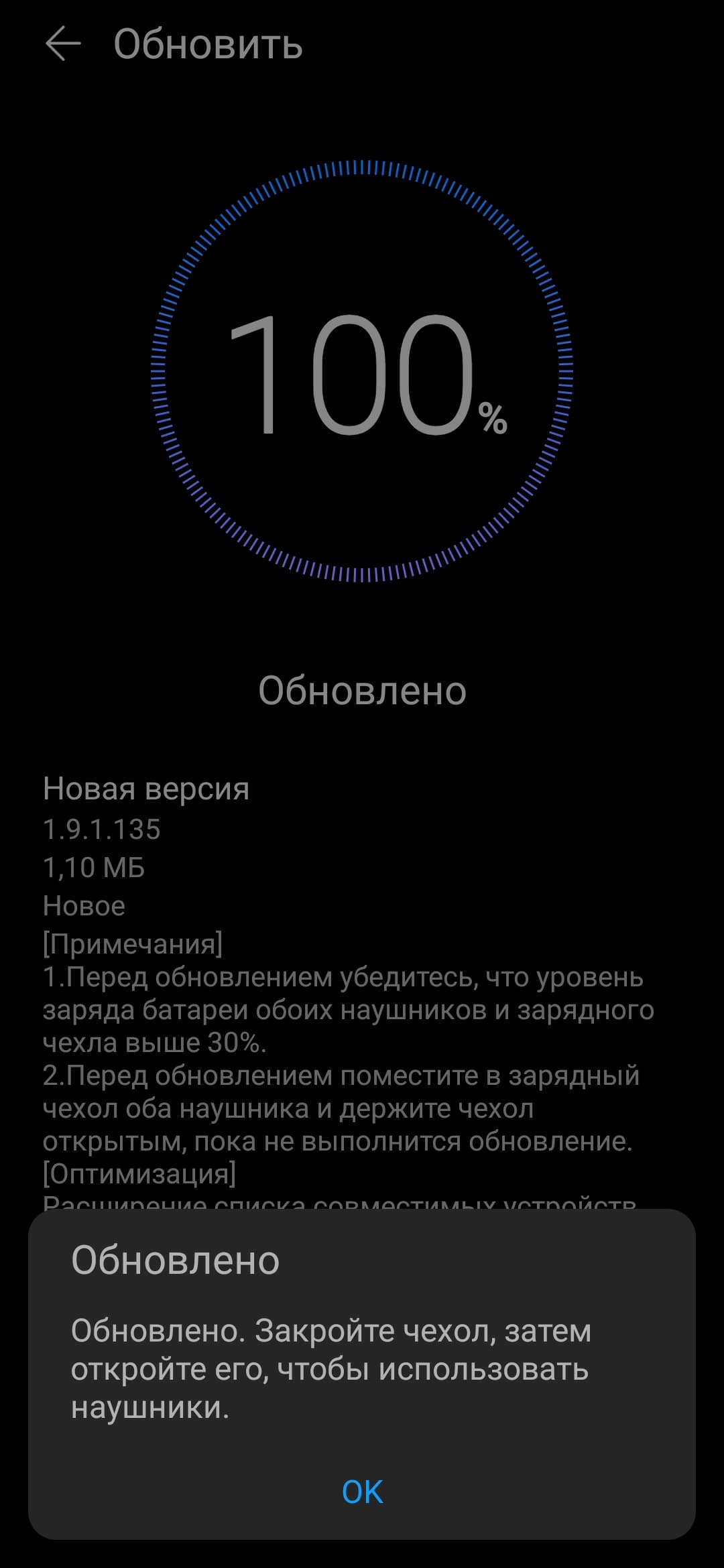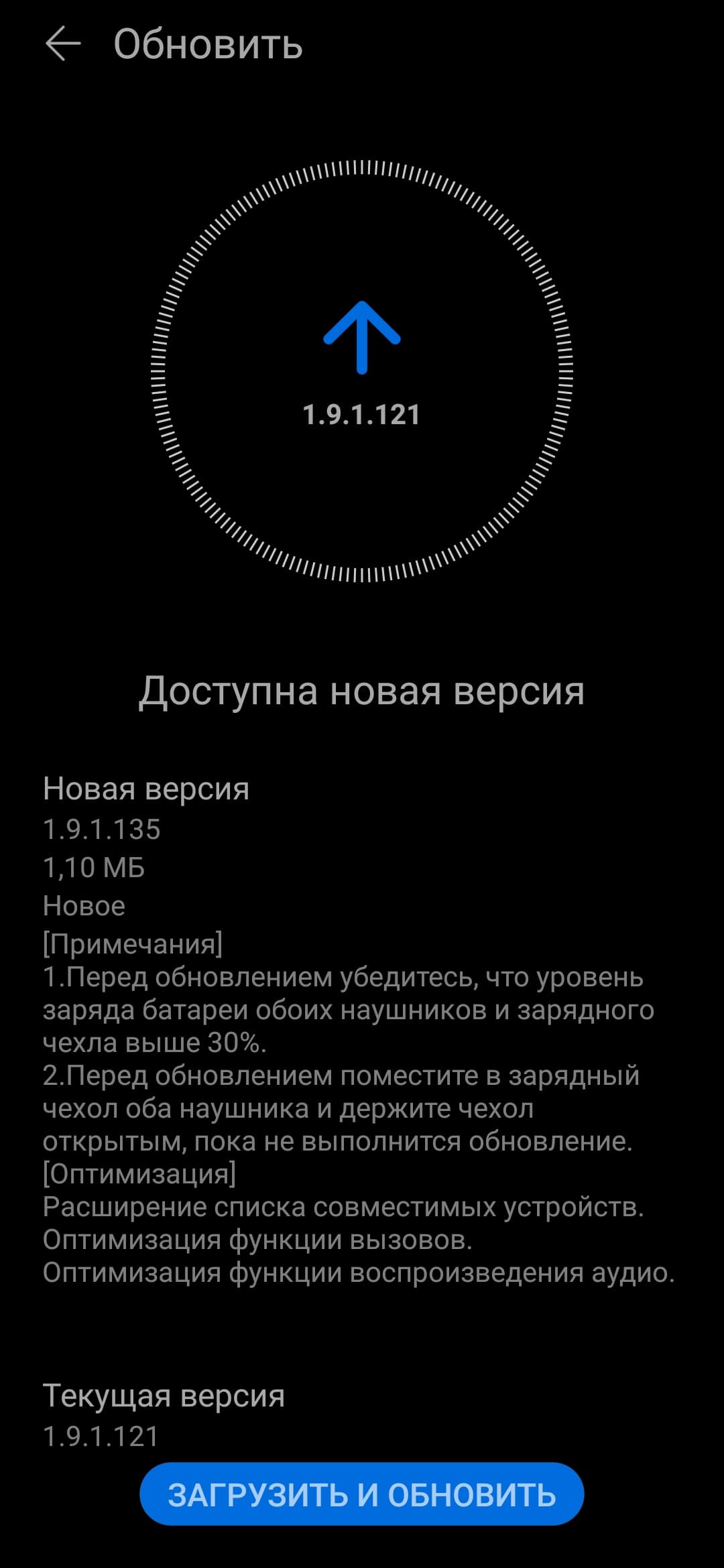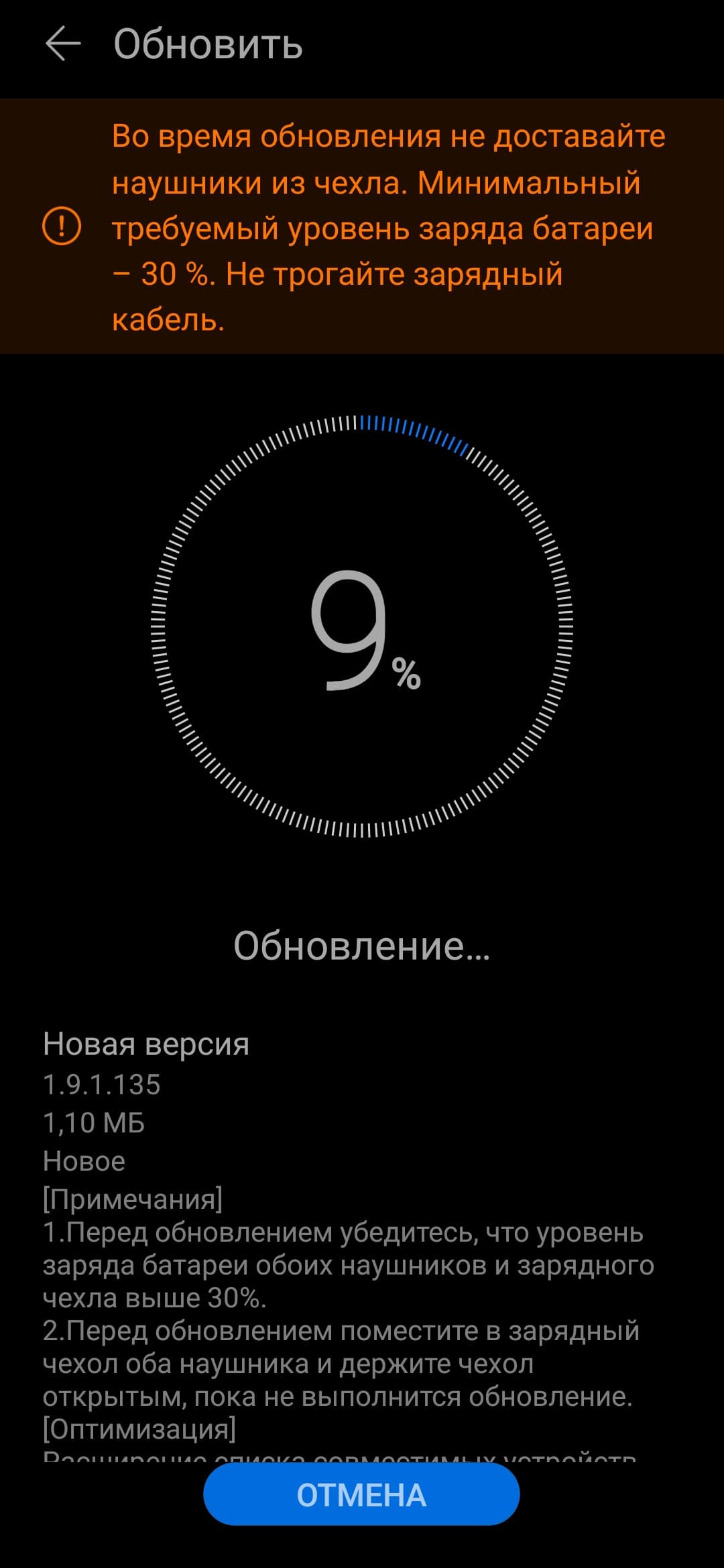 После подключения Huawei AI Life сразу проверяет наличие новых версий встроенного ПО. Если обновления есть — предлагает их загрузить. Игнорировать это предложение не стоит по причинам, о которых мы поговорим ниже. Процесс установки занял у нас чуть менее 5 минут.