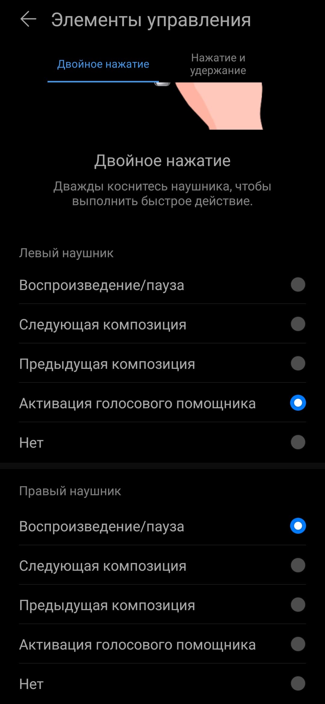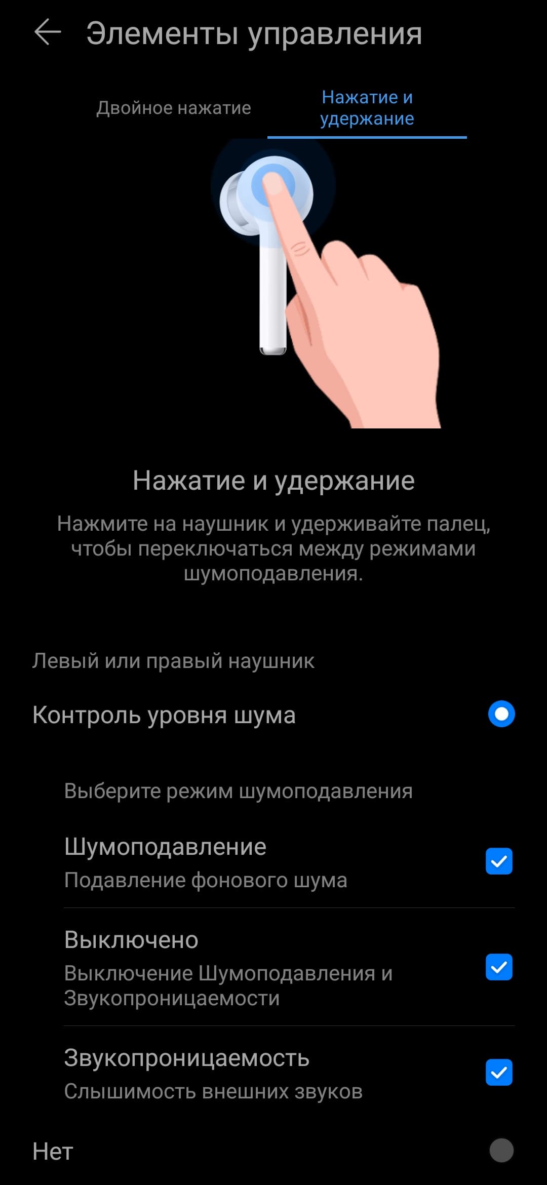 Для двойного нажатия доступны различные варианты управления воспроизведением, а также активация голосового помощника. Но самое интересное обнаруживается на странице настройки длинного касания. Одно из последних обновлений прошивки устройства добавило третий режим — «звукопроницаемость», который мы ранее встречали в основном у гарнитур «премиального» класса.