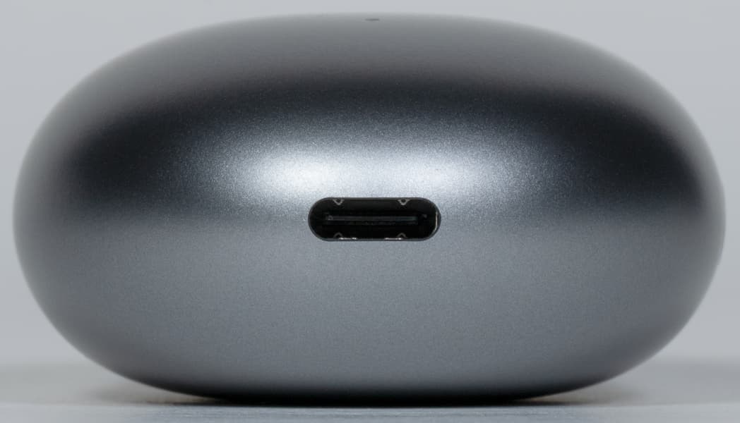 На дне кейса размещен порт USB Type C для зарядки. Пластик внешней части футляра матовый и устойчив к появлению пятен от прикосновений.