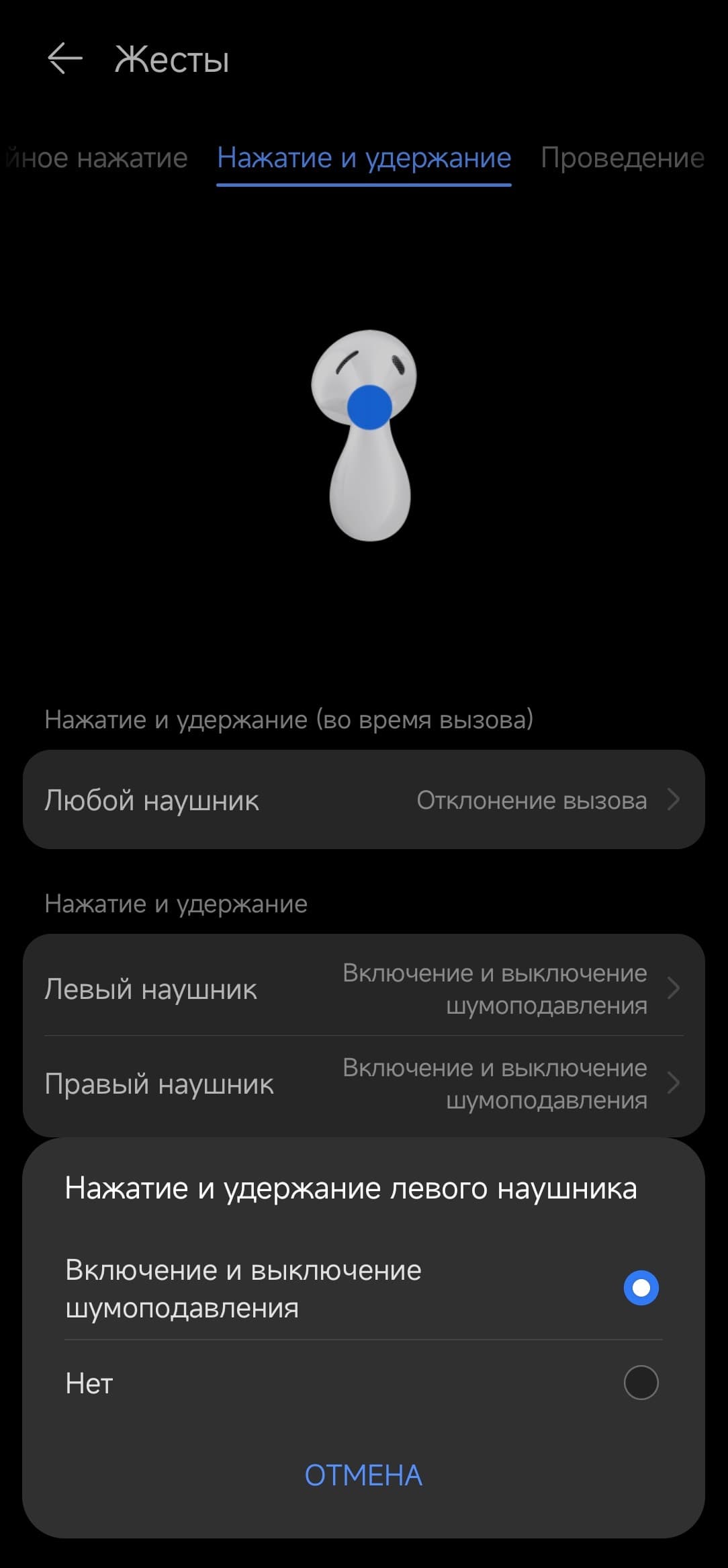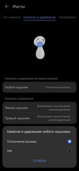 Ну и, конечно, с главного экрана настраивается активное шумоподавление. Можно вручную выбрать более агрессивный вариант работы или менее — «Обычный» или «Комфорт» соответственно. Либо доверить выбор автоматике, остановившись на режиме «Динамический». Режима «звуковой прозрачности» тут нет, для наушников-«вкладышей» он не актуален ввиду далеко не самого высокого уровня пассивной звукоизоляции.