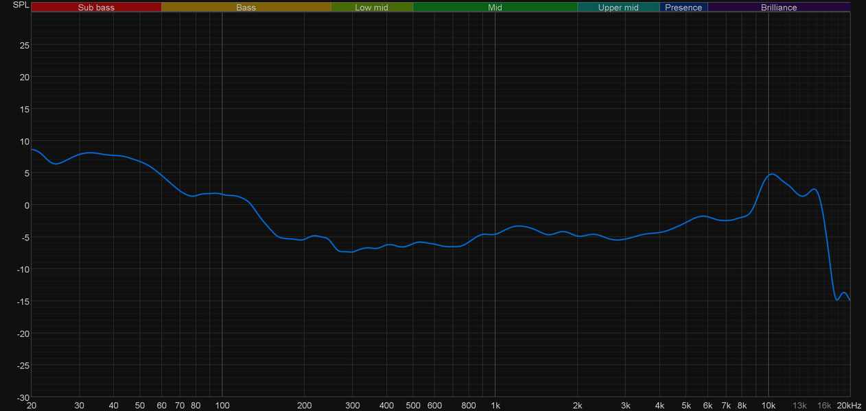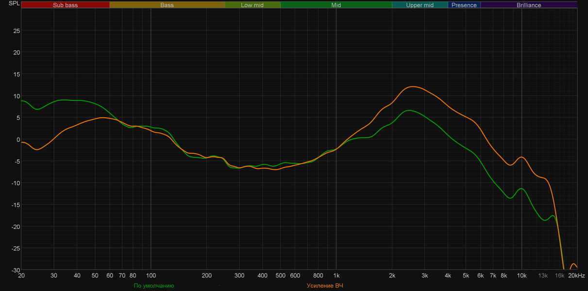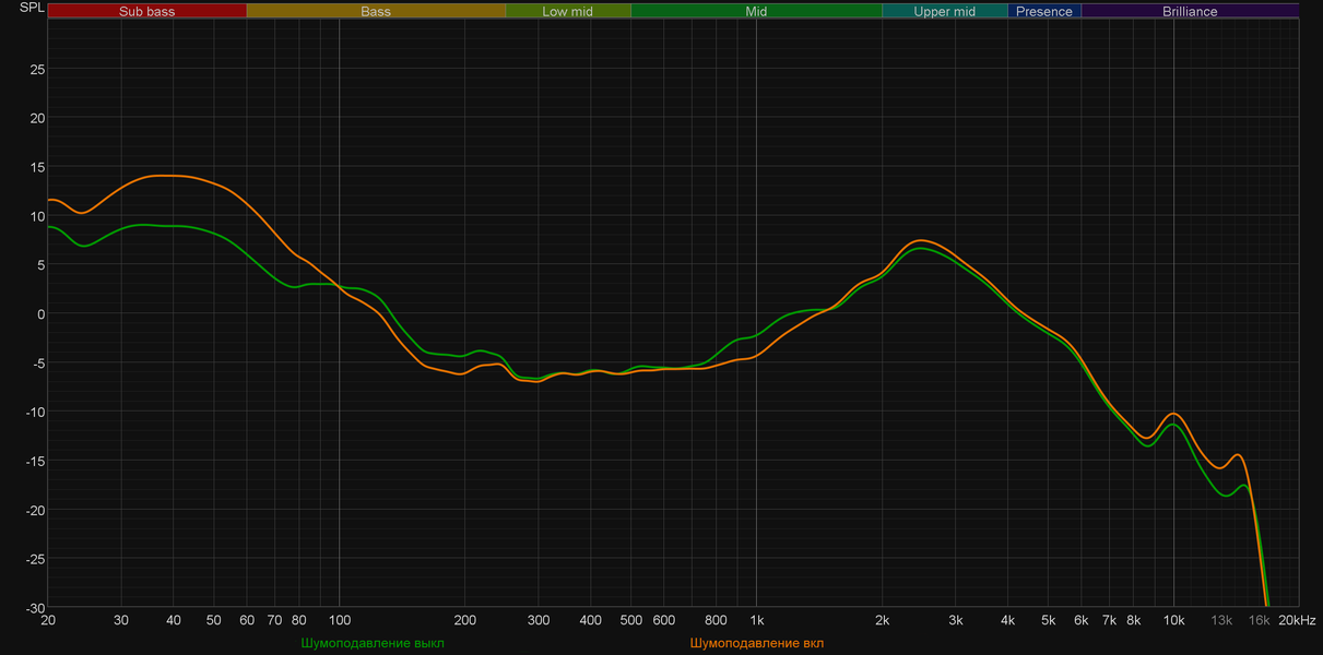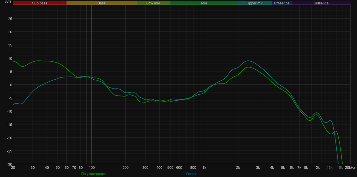 При этом еще раз важно отметить, что акцентом на НЧ-регистре легко управлять. Стоит чуть ослабить посадку, как он воспринимается уже не так остро. Плюс эквалайзер позволяет избавиться от него практически полностью. Предлагаемые пресеты делают ровно то, чего ожидаешь от них, исходя из названия — выделяют высокие или низкие частоты, подчеркивают голос... На последней иллюстрации представлен график, полученный после активации созданного нами профиля, где мы как раз попытались на скорую руку снизить акцент на низкочастотном диапазоне и немного подчеркнуть середину. Как видно, сделать это вполне удалось.