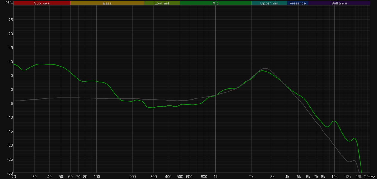 График АЧХ показан на фоне кривой IDF (IEM diffuse field compensation), предоставленной производителем используемого стенда. Ее задача — помочь скомпенсировать резонансные явления в имитированном слуховом канале и особенности оборудования, создав «звуковой профиль», максимально корректно иллюстрирующий то, как звучание наушников воспринимается слушателем. Ее можно рассматривать как адаптированный под конкретное устройство аналог так называемой «кривой Хармана», созданной командой Harman International под руководством доктора Шона Олива. Скомпенсируем полученный график АЧХ в соответствии с кривой IDF.