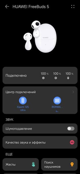 Организацию подключения к нескольким устройствам в линейке FreeBuds мы неоднократно хвалили, сделаем это еще раз: «мультипойнт» реализован максимально удобно. Для сопряжения со вторым устройством достаточно нажать кнопку на боку кейса, не прерывая связи с первым. Далее оно появляется в «Центре подключений» и на главном экране — видно, откуда транслируется звук, можно настроить приоритет того или иного источника. Впрочем, делать это особой необходимости нет, всё и так работает: фокус смещается в нужный момент, оба устройства можно использовать и для общения, и для прослушивания музыки или другого контента.