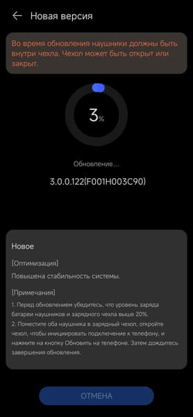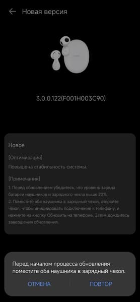После первого подключения гарнитура проверяет наличие свежей прошивки, если находит — устанавливает за несколько минут. Далее пользователь оказывается на главном экране устройства, в верхней части которого размещена информация о зарядке каждого из наушников отдельно и кейса.