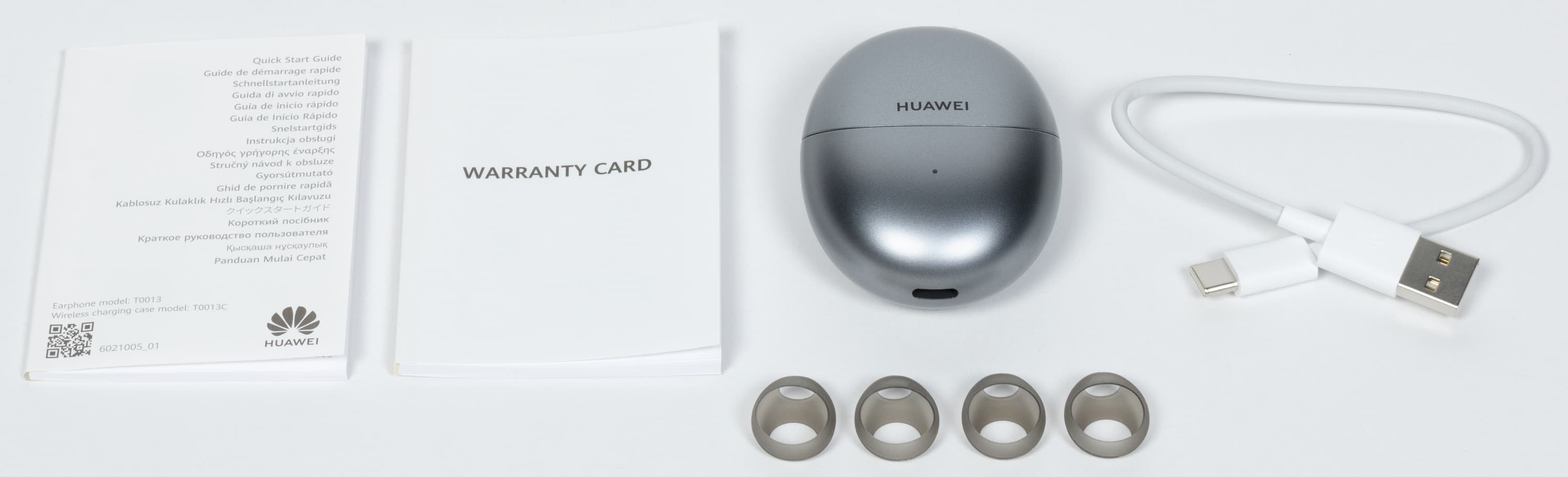 В комплект поставки входят сами наушники в зарядном кейсе, кабель USB-A — USB-C длиной 25 см, а также силиконовые накладки.