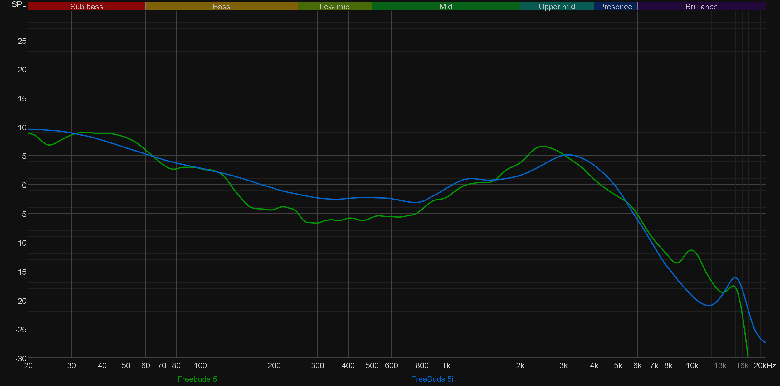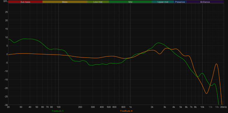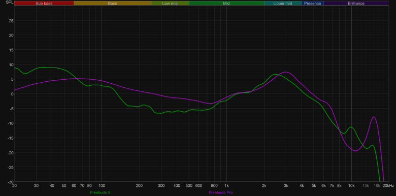 Ну и «мощные басы» создатели гарнитуры обеспечили — их в достатке. Не секрет, что «вкладыши» в силу особенностей посадки не очень хорошо передают НЧ-диапазон, этот нюанс разработчики FreeBuds 5 щедро компенсировали акцентом на басе, который серьезно форсирован, но при этом обладает неплохой атакой и почти не склонен к «бубнению и гудению». Традиционно проиллюстрируем сказанное с помощью графика АЧХ.