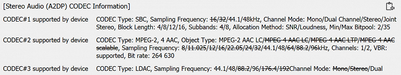 Кстати, время проверить, действительно ли есть поддержка всех заявленных кодеков при помощи утилиты Bluetooth Tweaker. Все три кодека на месте: SBC, AAC, LDAC.