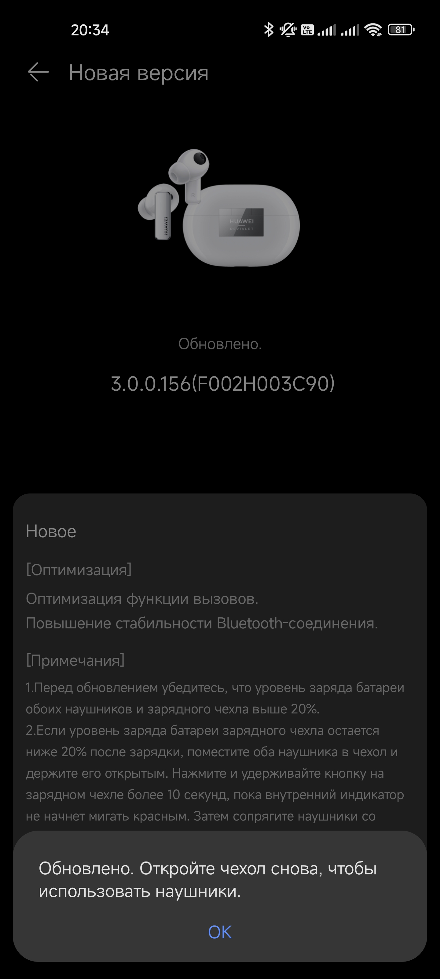 После этого мы оказываемся на главной странице устройства, где сразу получаем предложение обновить его прошивку до свежей версии — соглашаемся. Процесс занял у нас порядка пяти минут, после чего мы вновь вернулись на страницу управления Huawei FreeBuds Pro 2, где можно увидеть уровень зарядки каждого из наушников отдельно, а также кейса.