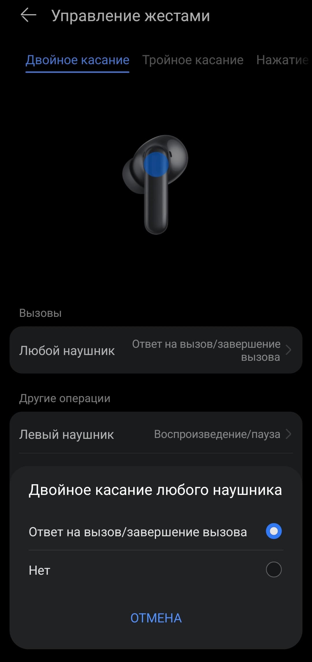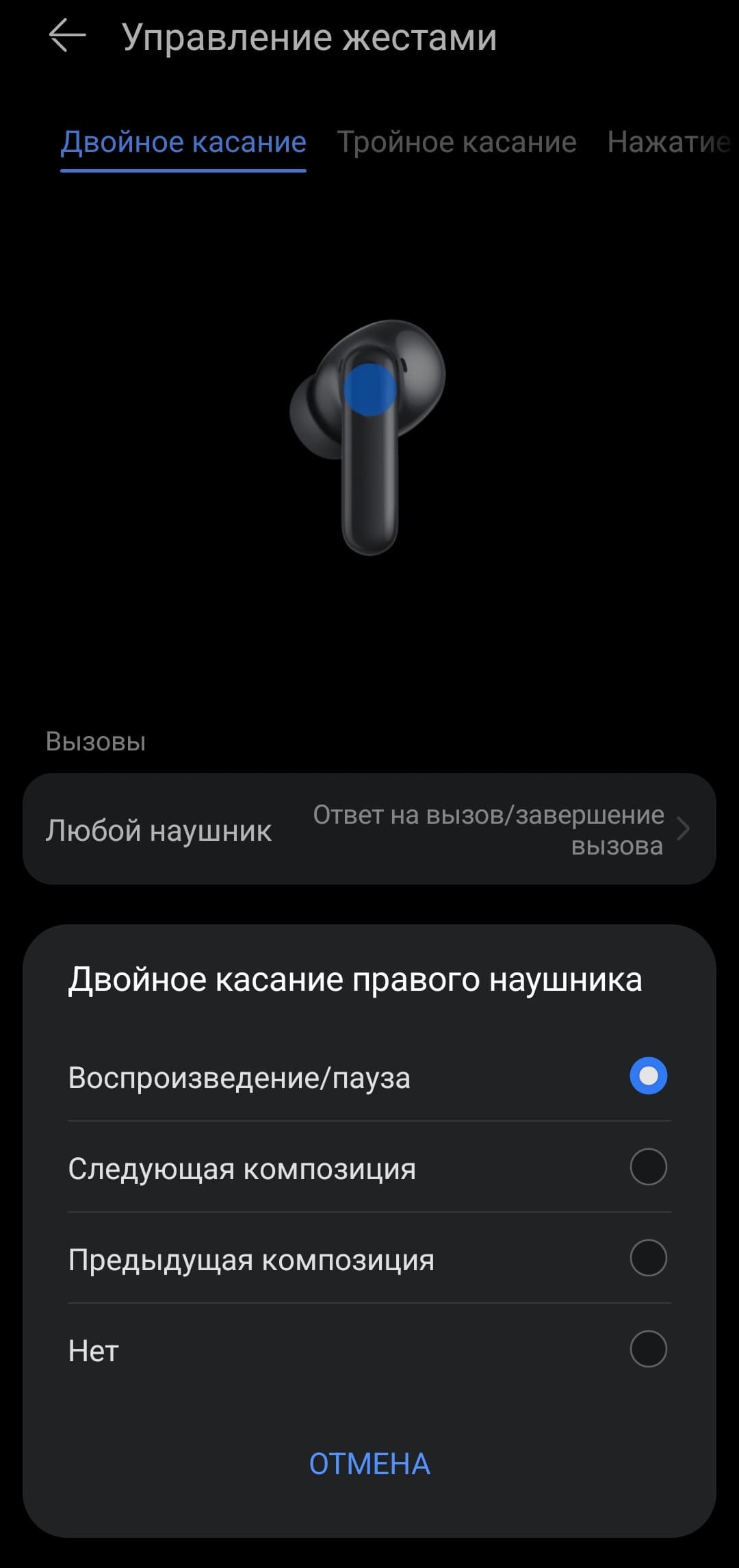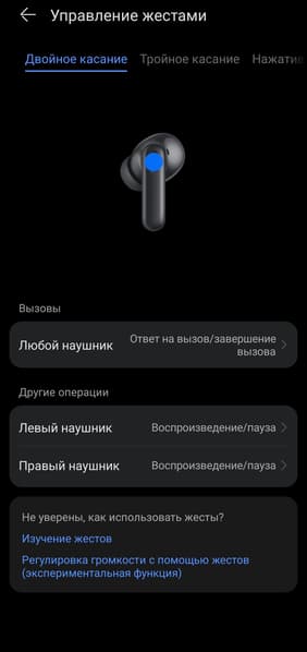 Двойное касание используется для управления воспроизведением или переключения треков. Система различает касания правого и левого наушника, поэтому левый можно назначить для перехода к предыдущему треку, а правый — к следующему.