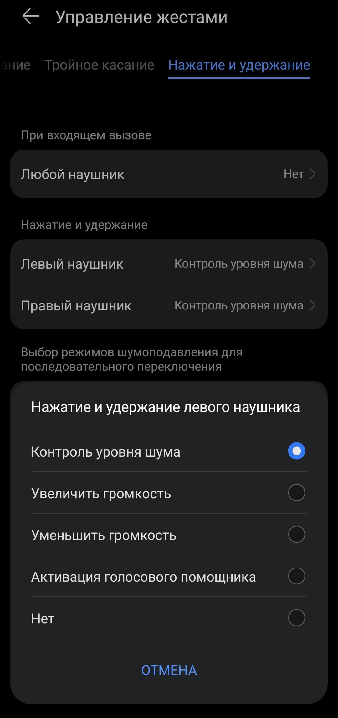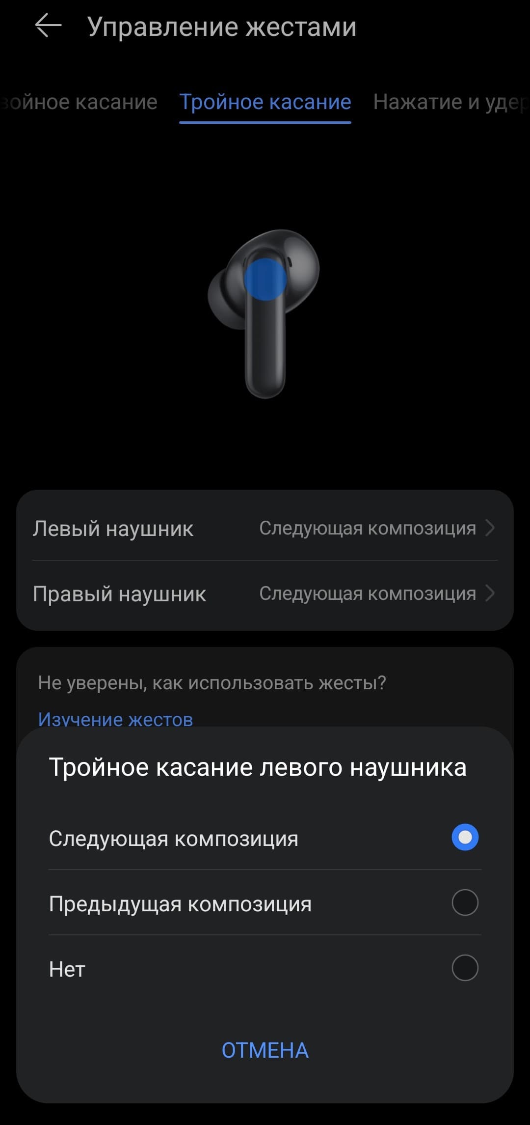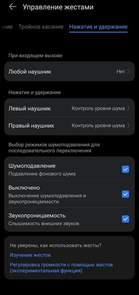 При этом перенос управления переключением треков на двойное касание не имеет особого смысла: для тройного других вариантов все равно нет — оно может либо переключать треки, либо не делать ничего. Длинное касание, в свою очередь, отвечает за смену режимов шумоподавления и активацию голосового помощника, либо регулировку громкости — придется выбирать, что важнее.