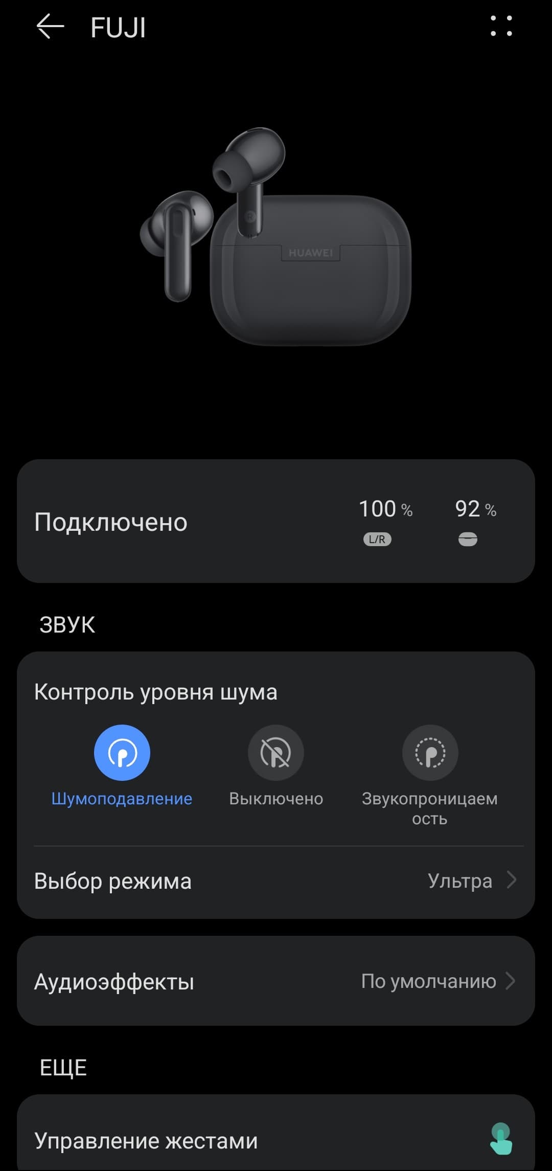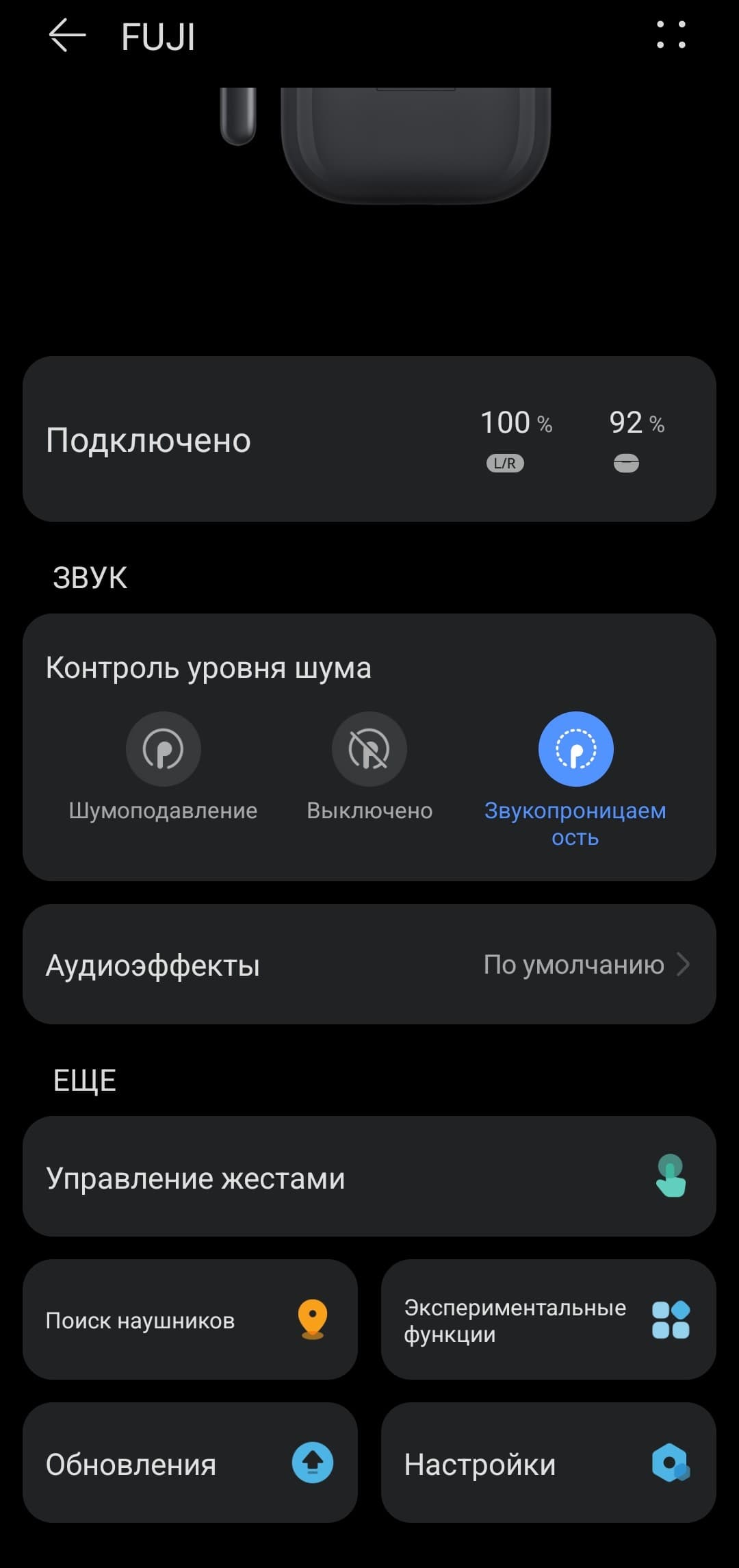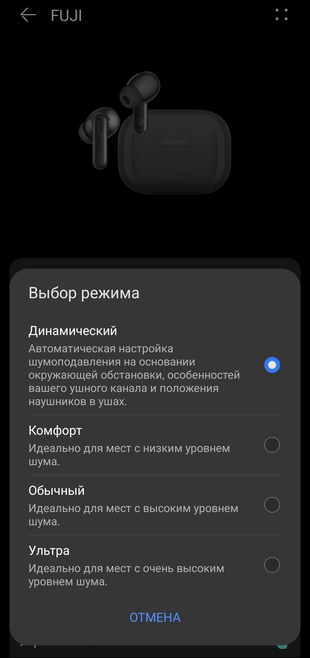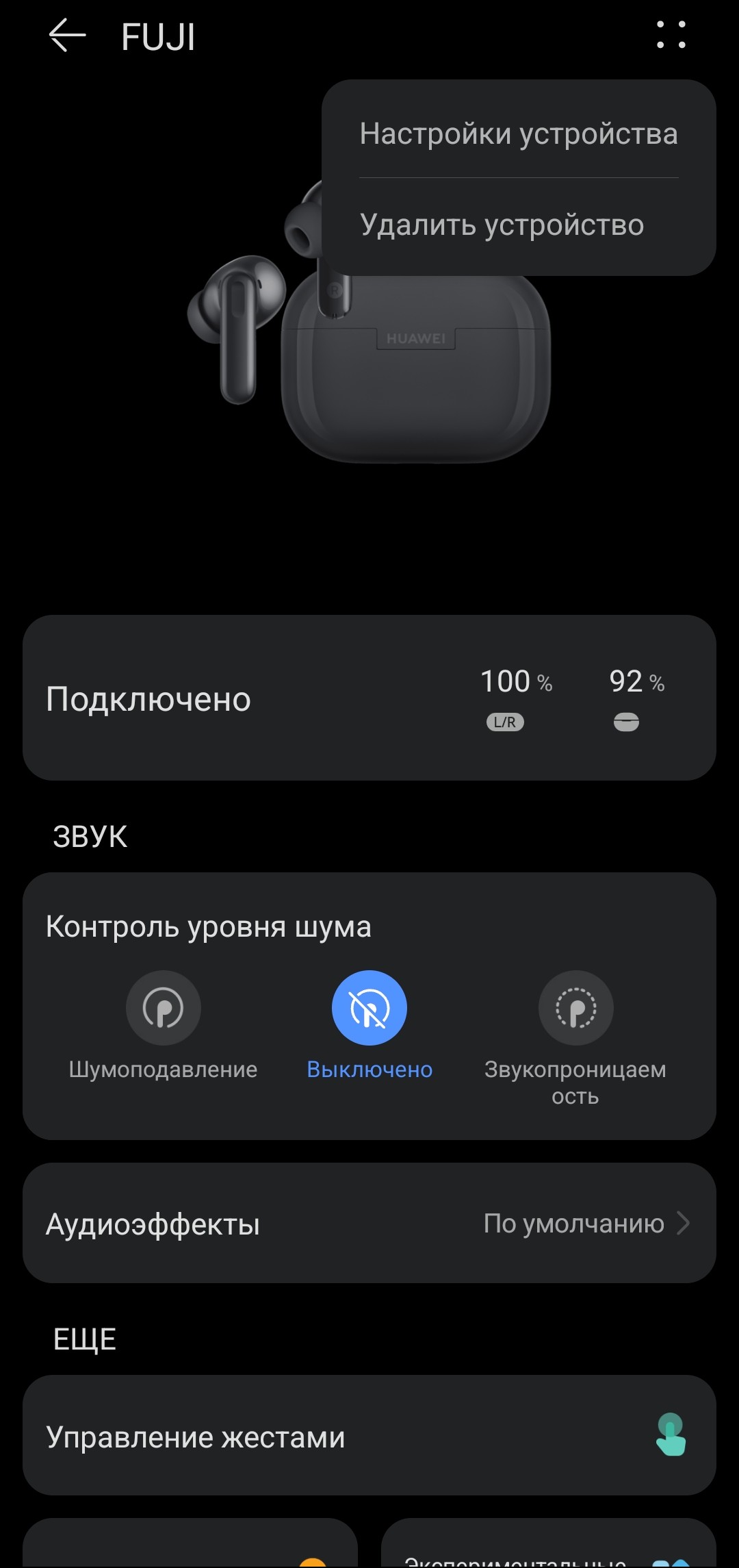 В верхней части главной страницы FreeBuds SE 4 ANC в приложении отображается модуль с уровнем заряда наушников и кейса. Нажатие на иконку в правом верхнем углу открывает меню дополнительных настроек, где представлены сведения об устройстве и возможность изменить его имя. Ниже расположен модуль управления системой активного шумоподавления с четырьмя режимами работы: тремя фиксированными и одним динамическим. В этом же разделе можно включить режим «звукопроницаемости», при котором внешние звуки транслируются в динамики через микрофоны.