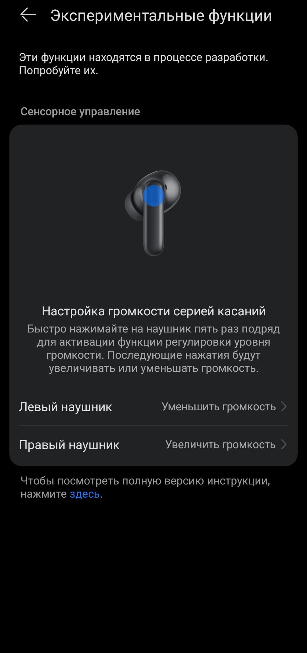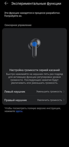 В разделе «Экспериментальные функции» обнаружилась возможность включить управления громкостью пятикратным касанием сенсорной зоны — в удачности этого эксперимента есть большие сомнения, это тот случай, когда достать телефон из кармана оказывается проще. Но, возможно, кому-то и будет удобно. В разделе с прочими настройками приложение позволяет принудительно проверить наличие обновлений прошивки, включить режим снижения задержки звука и почитать довольно объемный и информативный раздел с ответами на часто задаваемые вопросы.