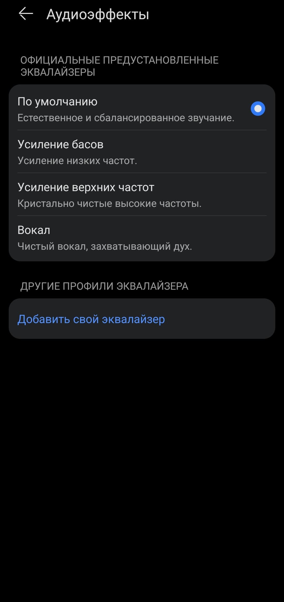 Предустановленные пресеты эквалайзера ведут себя предсказуемо: каждый звучит именно так, как следует из его названия. А заодно наглядно демонстрируют нам, что эквалайзер эффективно работает.