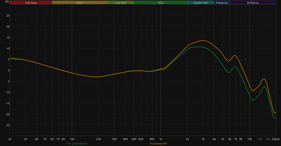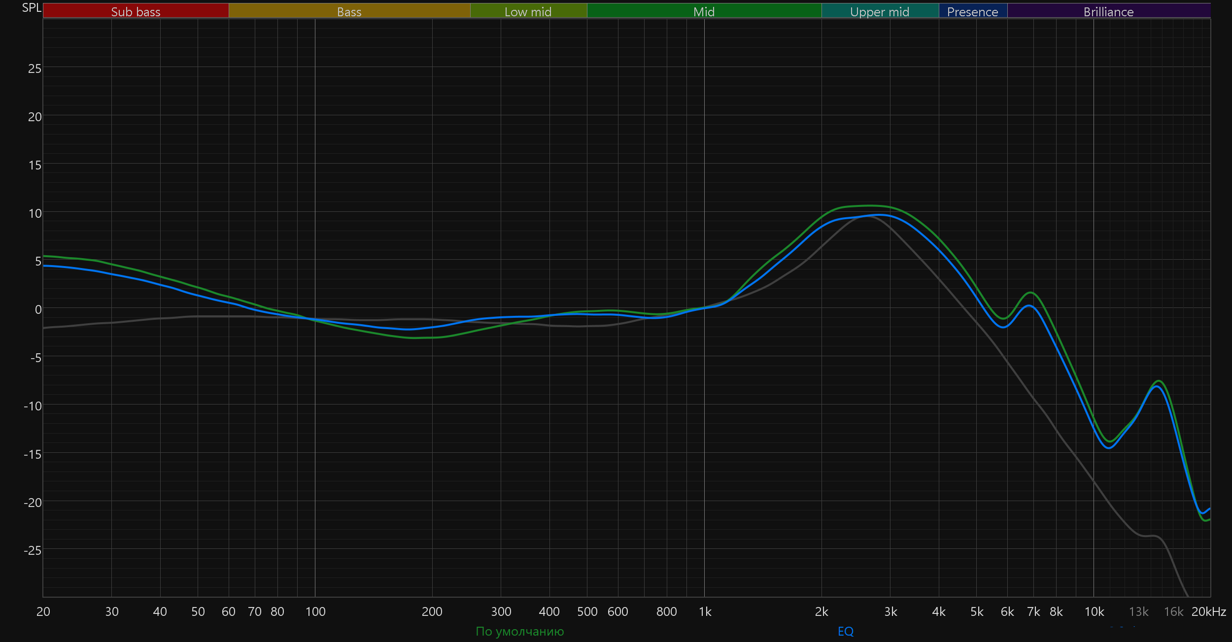 В ходе тестов мы пробовали «подтянуть» АЧХ к целевой кривой, используя 10-полосный эквалайзер в приложении. Идеального совпадения достичь не удалось, но результат заметен: низкие частоты стали чуть плотнее, общее звучание воспринимается более сбалансированным.