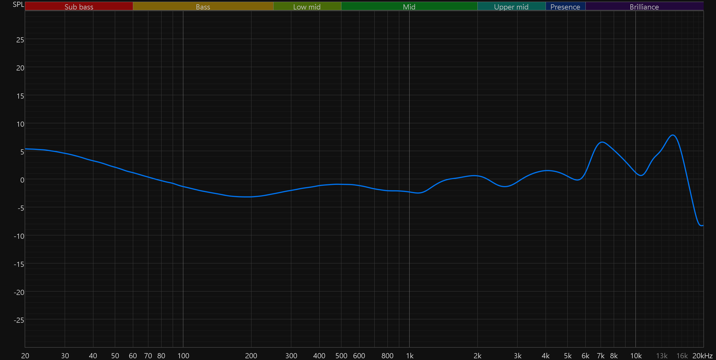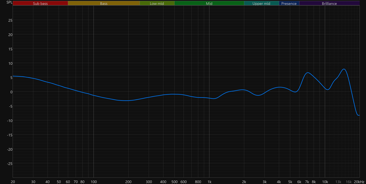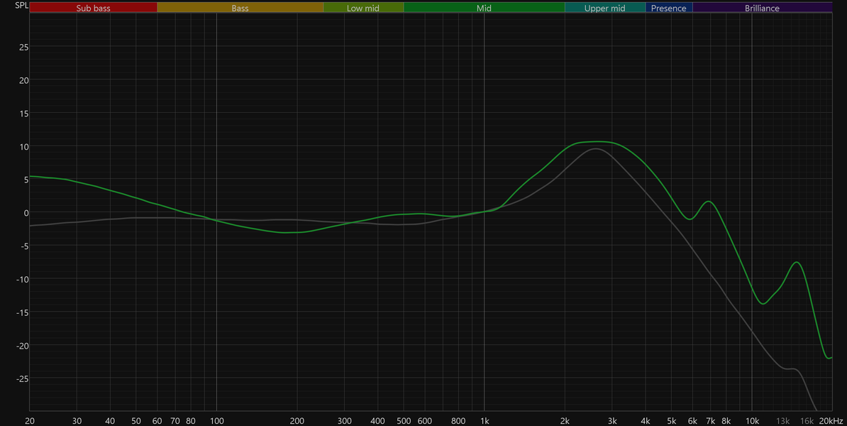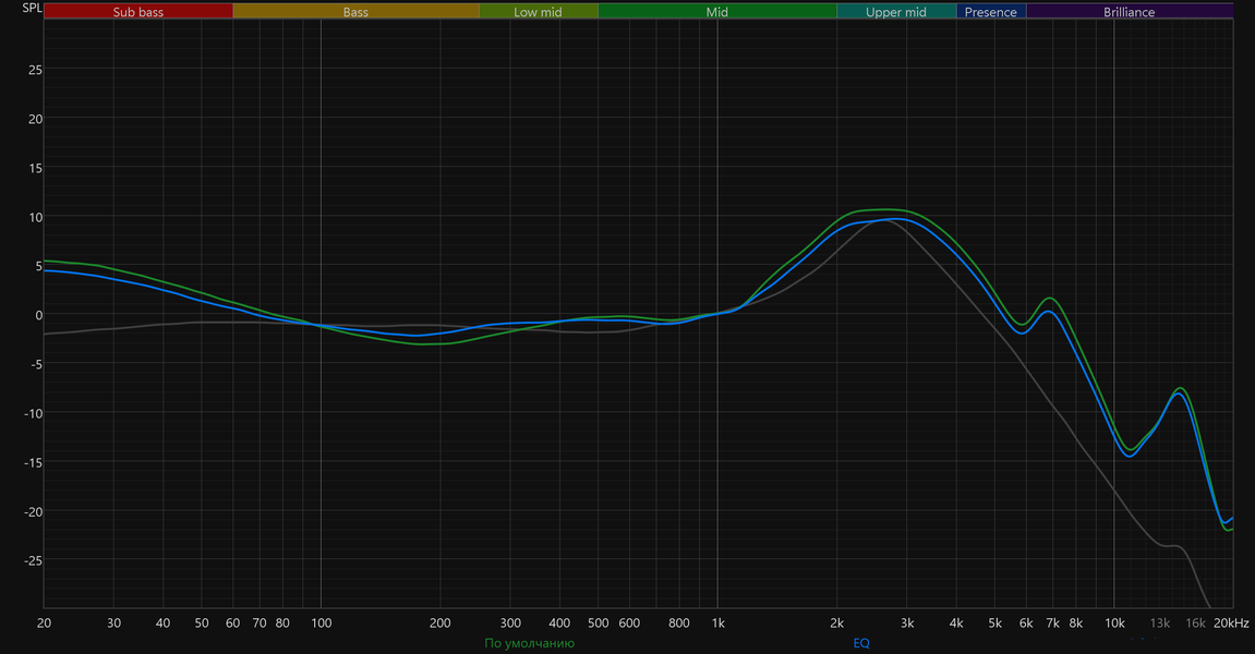 График АЧХ показан на фоне кривой IDF (IEM diffuse field compensation), предоставленной производителем используемого стенда. Ее задача помочь скомпенсировать резонансные явления в имитированном слуховом канале и особенности оборудования, создав «звуковой профиль», максимально корректно иллюстрирующий то, как звучание наушников воспринимается слушателем. Ее можно рассматривать как адаптированный под конкретное устройство аналог так называемой кривой Хармана, созданной командой Harman International под руководством доктора Шона Олива. Скомпенсируем полученный график АЧХ в соответствии с кривой IDF в таком виде он наиболее полно иллюстрирует субъективные впечатления от прослушивания.