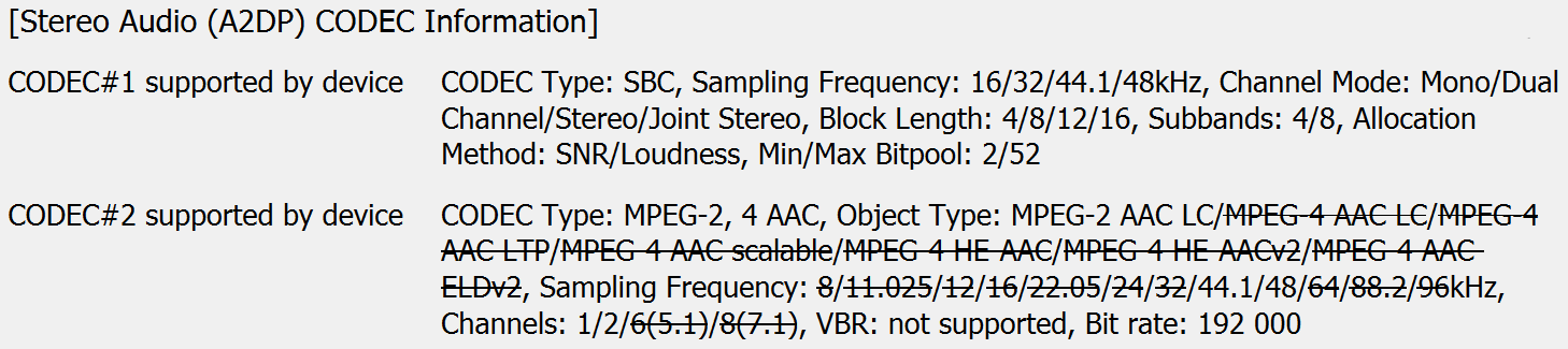 Полный список поддерживаемых кодеков и их режимов мы традиционно получили с помощью утилиты Bluetooth Tweaker. Тут по-прежнему необходимый и достаточный минимум: SBC и AAC.