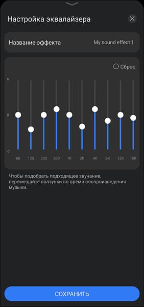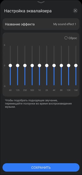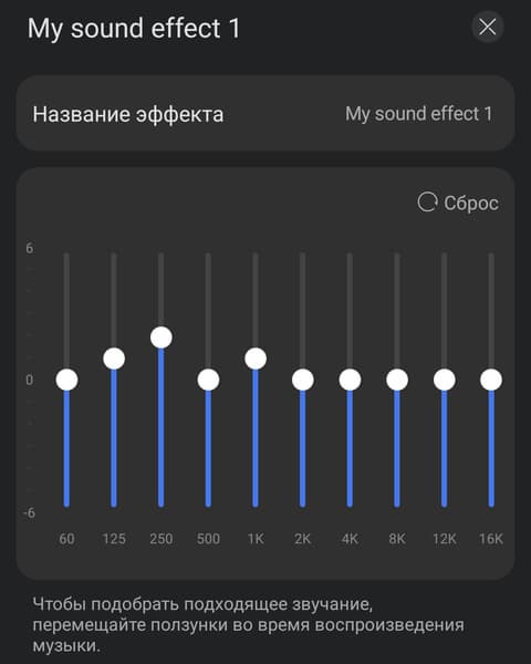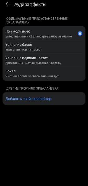 В меню аудиоэффектов доступны четыре предустановленных пресета. Также предусмотрена возможность создания собственных настроек с помощью 10-полосного эквалайзера, аналогичного использующемуся во флагманских моделях наушников производителя. Последнее, конечно, особенно приятно — приходу полноценных настроек в бюджетную серию можно только порадоваться.