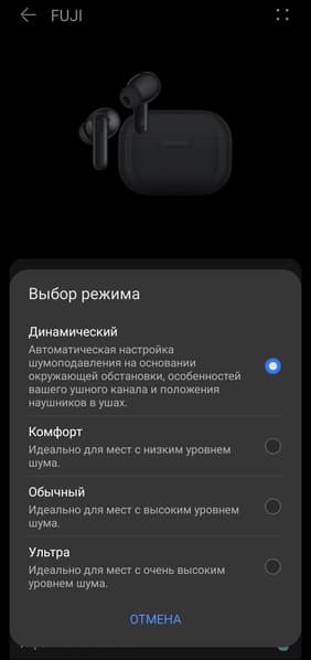 Режим можно выбрать вручную либо доверить это автоматике. Последняя в целом справляется, но не без нюансов: реакция на смену обстановки иногда запаздывает. Например, шум уже появился, а система начинает подавлять его только через несколько секунд. Возможна и обратная ситуация — тишина наступила, а шумоподавление все еще работает на полную, создавая знакомое многим ощущение «давления в голове». Это чувство возникает только в режиме «Ультра» и не сразу, поэтому пользоваться им на постоянной основе вполне можно, если нет выраженной чувствительности.