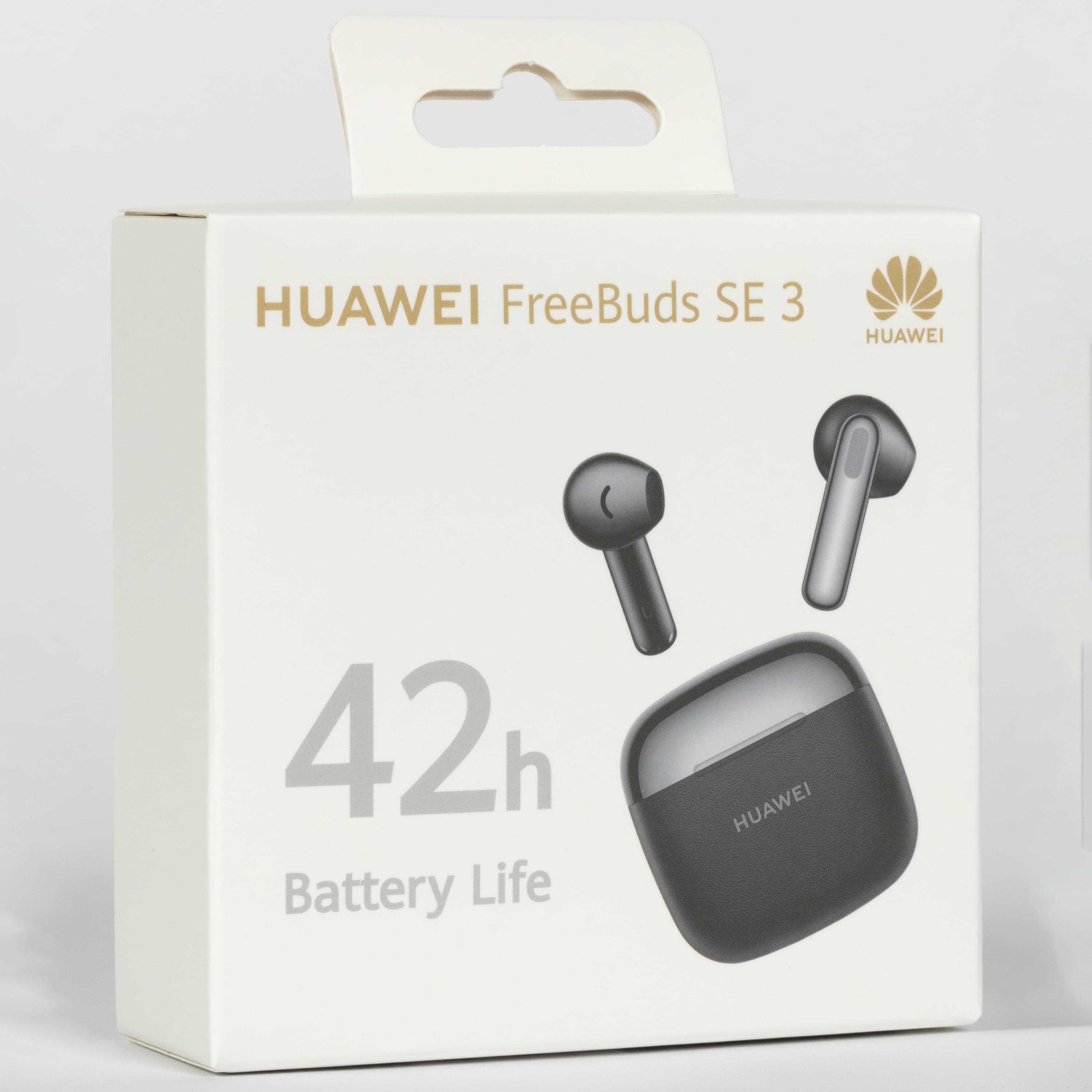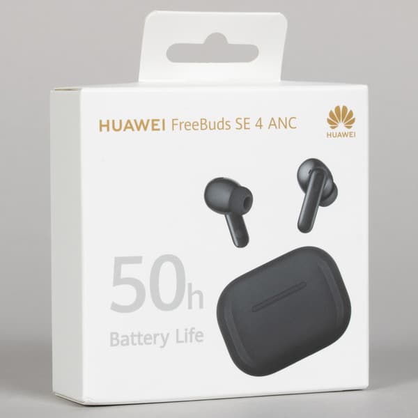 Упаковка традиционная для всех наушников Huawei: плотный белый картон, изображение, золотистые надписи и логотипы — все на месте. В серии SE производитель неизменно делает акцент на автономности, крупно указывая ее прямо на крышке коробки. Несмотря на смену формата, эта особенность сохранилась и у FreeBuds SE 4 ANC.