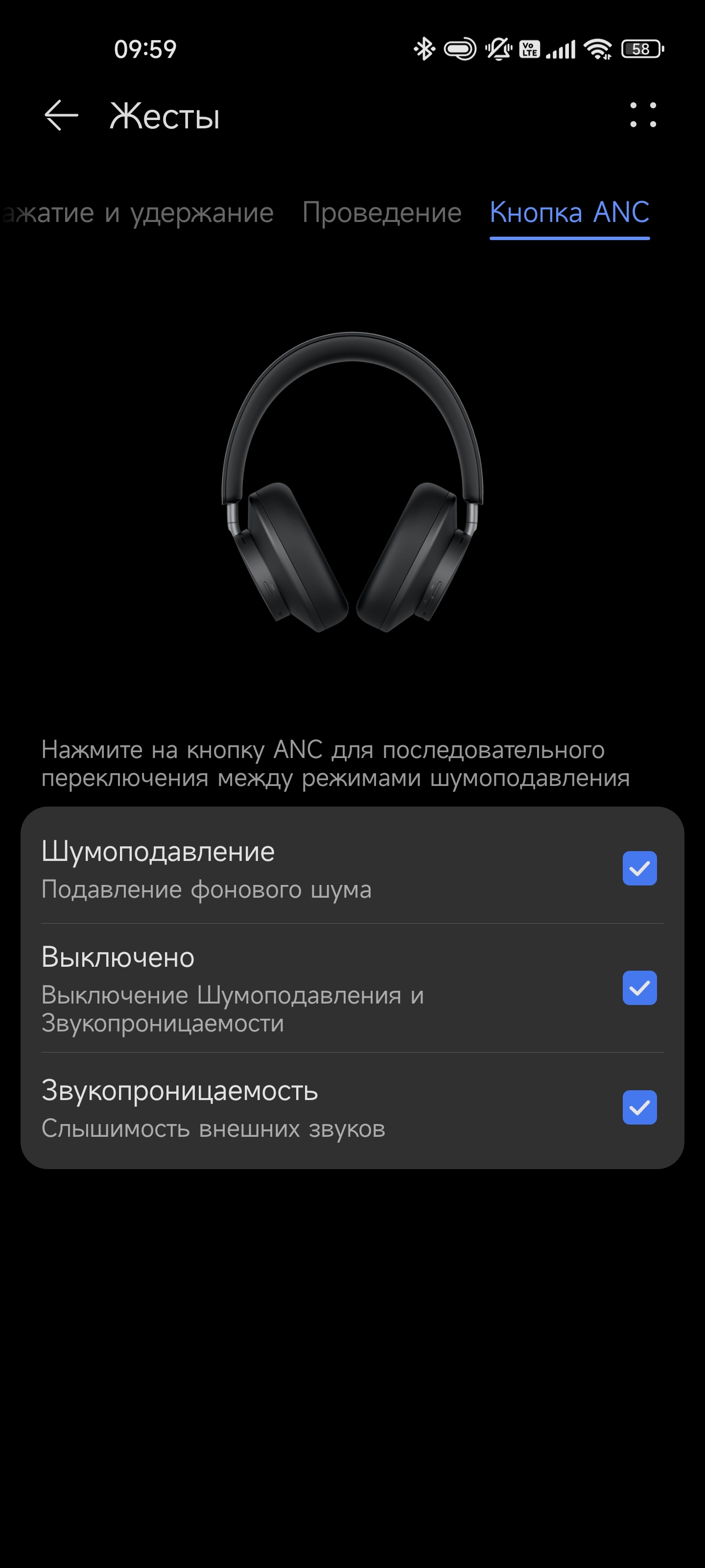 Ну а мы возвращаемся в приложение. Еще одна из самых интересных особенностей FreeBuds Studio — это, конечно, система активного шумоподавления, имеющая три режима работы: «комфорт», «обычный» и «ультра», которые можно включить в приложении. По умолчанию выбрана опция динамического переключения — наушники анализируют уровень шума и сами решают, какой из вариантов работы «шумодава» актуален.
