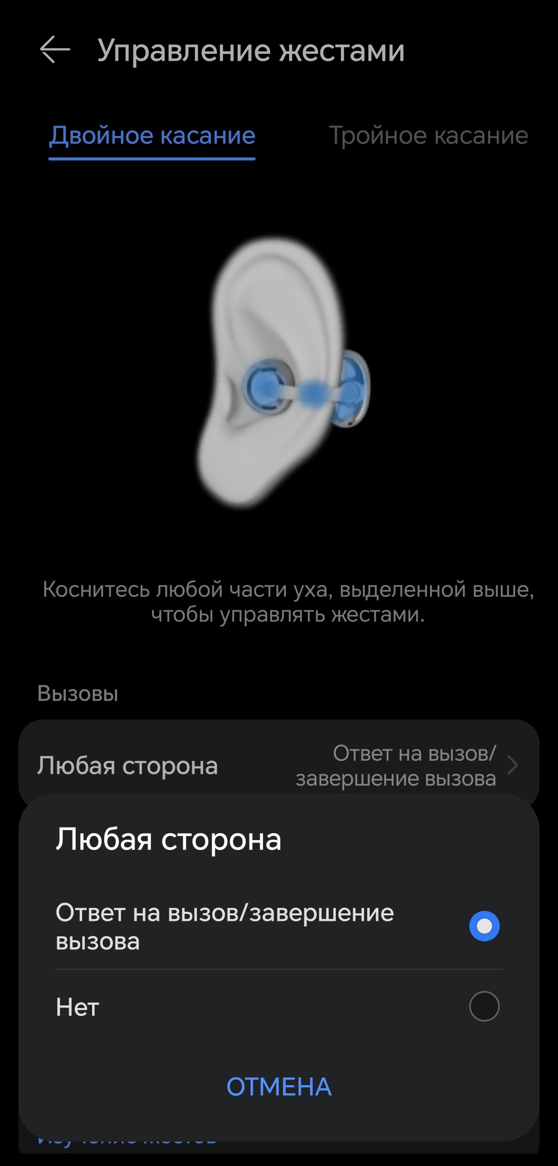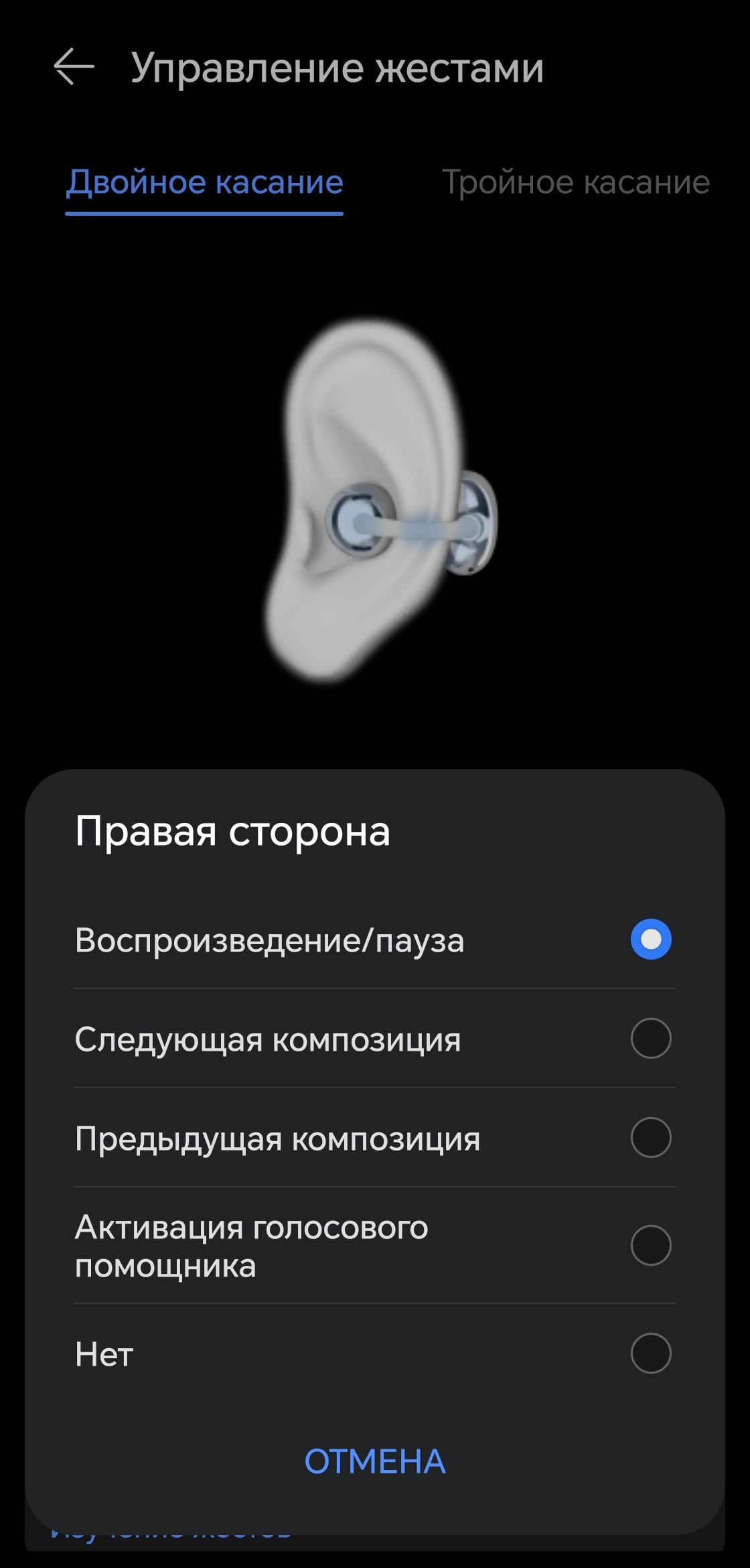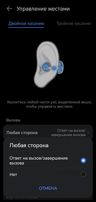 Профиль управления настраивается, но вариантов его организации не так-то и много. Однократный тап заблокирован, чтобы избежать случайных срабатываний. На двойной можно назначить переключение треков, управление воспроизведением или вызов голосового помощника.