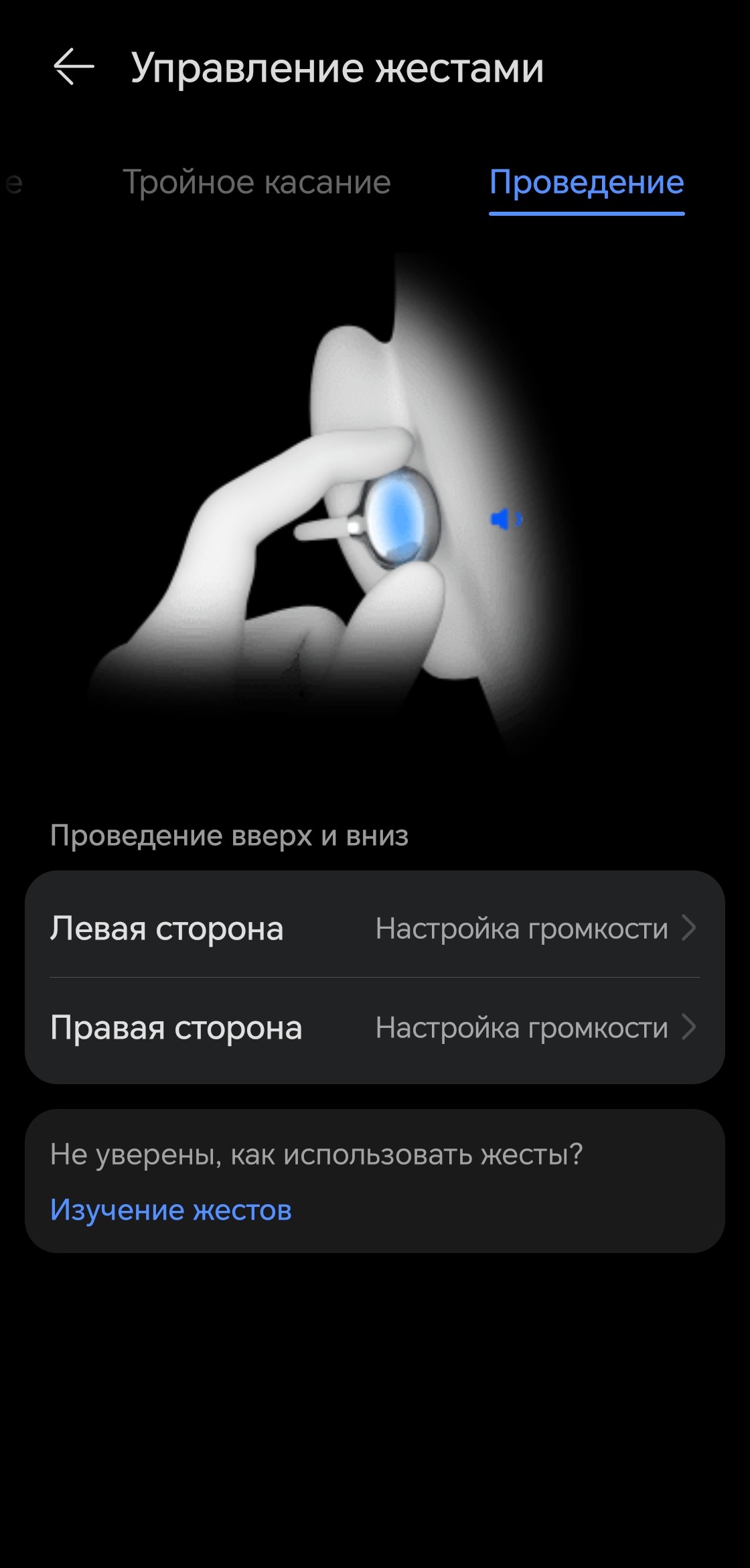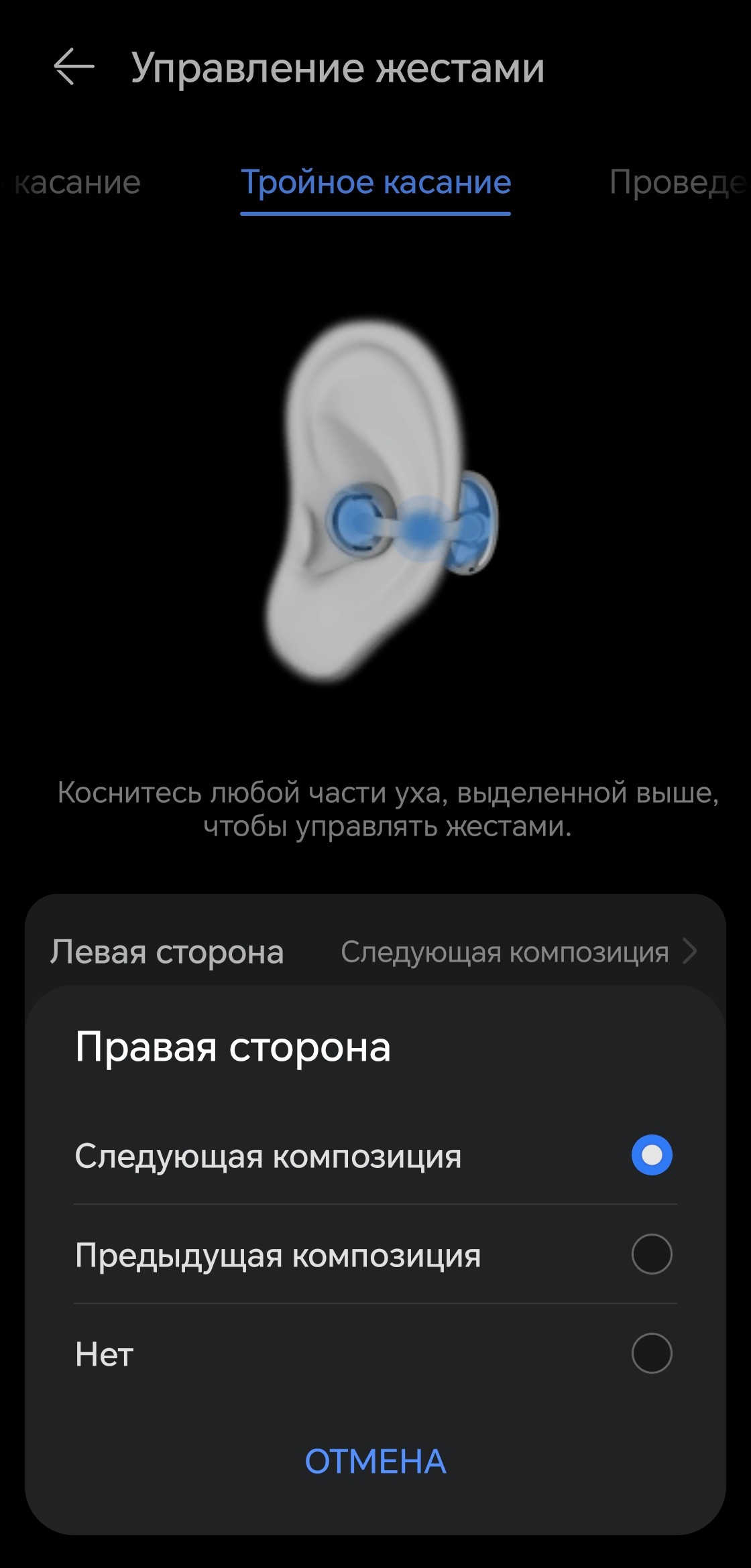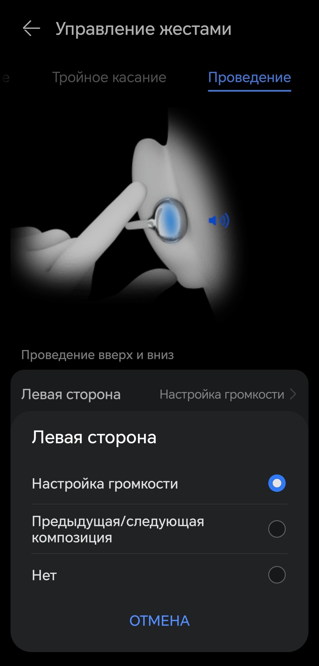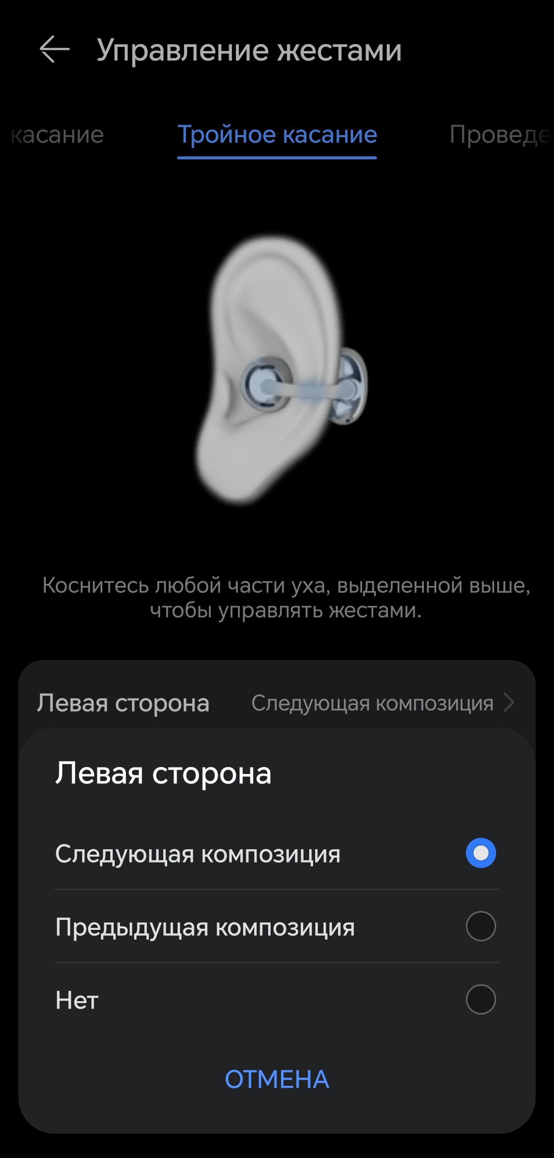 Тройное касание отвечает исключительно за перелистывание композиций — других вариантов не предусмотрено. Свайп по «фасолине» тоже можно назначить на эту функцию, но особого смысла в этом нет: дублировать действие, которое уже привязано к тройному тапу, вряд ли разумно, особенно в ущерб регулировке громкости. В общем, оптимальный вариант — просто оставить всё как есть. Стандартный профиль управления выстроен логично, привыкание проходит быстро.