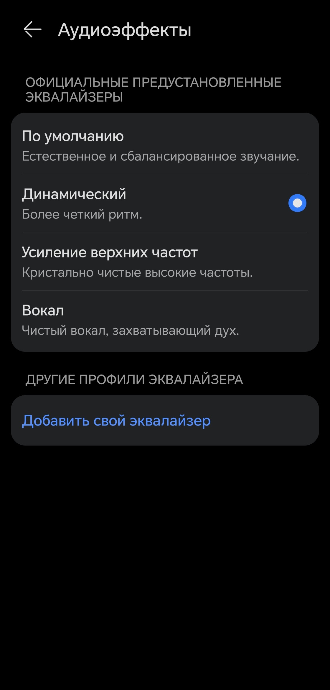 Остальные пресеты могут пригодиться в отдельных сценариях, но для постоянного прослушивания подходят слабо. В частности, режим «Вокал» хорошо показывает себя при просмотре разговорных видео: ослабление низких частот выводит середину на первый план и делает речь более разборчивой.