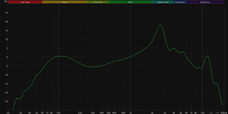 Саб-баса практически нет, но ожидать еще и его от наушников рассматриваемой конструкции — это перебор. Зато непосредственно бас не только присутствует, но еще и заметно форсирован на радость бассхедам. Правда сделано это за счет довольно очевидного провала в нижней середине, который заметно обедняет звучание, не лучшим образом влияя на так называемую «телесность». Ближе к середине диапазона подача выравнивается, но полностью ровной ее всё же не назовешь. Плавный подъем от низких к более высоким частотам не лучшим образом сказывается на передаче мужского вокала и снижает детализацию инструментов, что особенно заметно в живых записях.