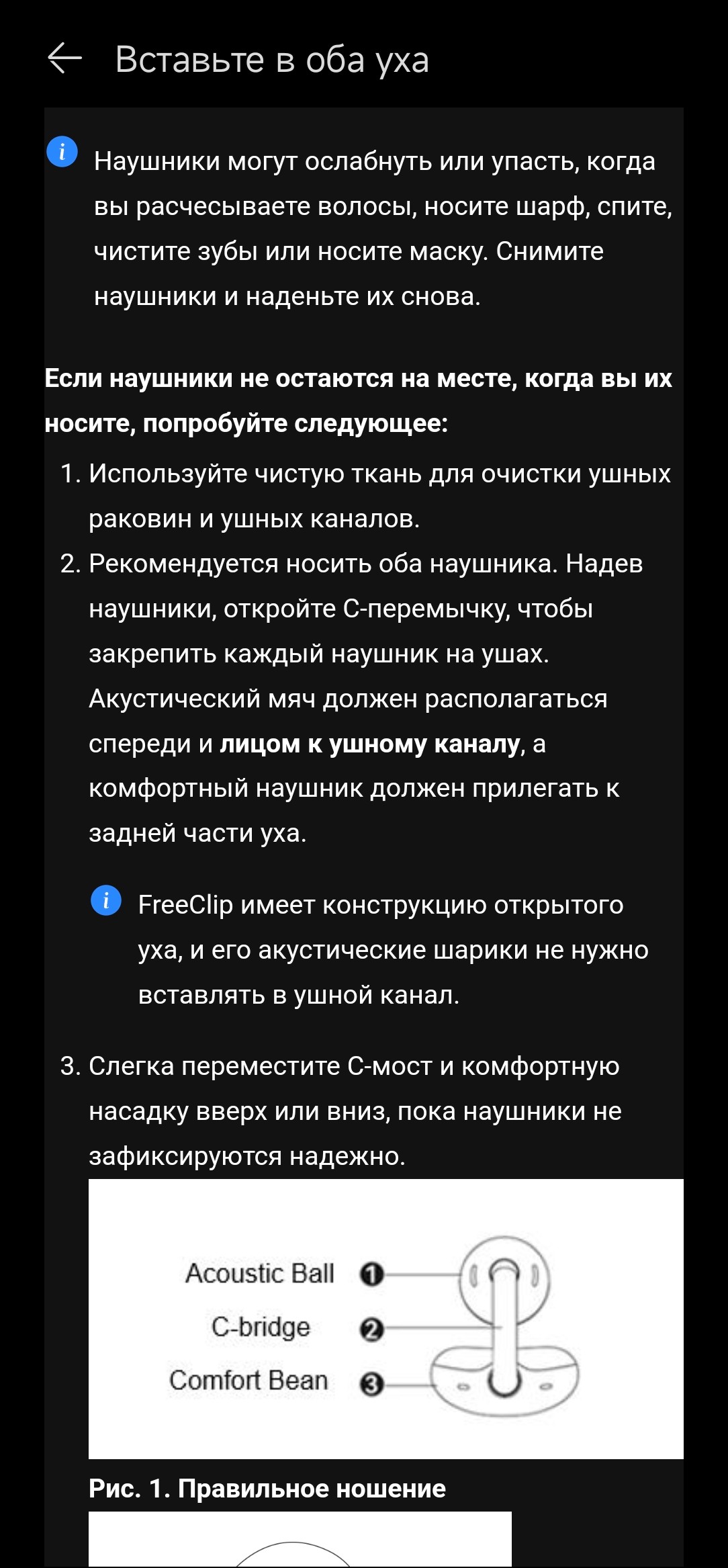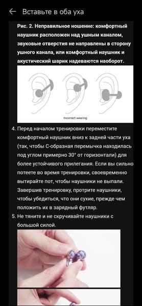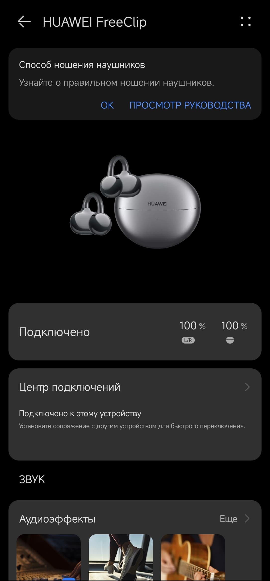 Использовать наушники Huawei без программы AI Life можно, но не нужно — многие возможности устройства без нее не доступны. Устанавливаем, подключаем гарнитуру. На главном экране сразу появляются индикаторы, позволяющие отдельно отслеживать зарядку наушников и кейса. Баннер в верхней части предлагает ознакомиться с инструкцией по правильному ношению FreeClip. В ней очень подробно и с картинками описаны все нюансы