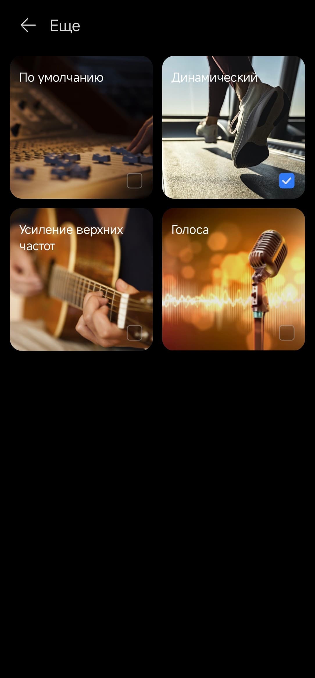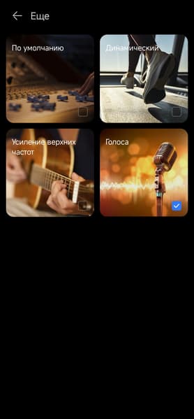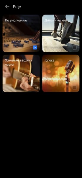 Пресеты эквалайзера делают ровно то, что должны, если судить по их названию. Напомним, что всего их четыре — звук по умолчанию мы видели выше, остальные три разберем сейчас.