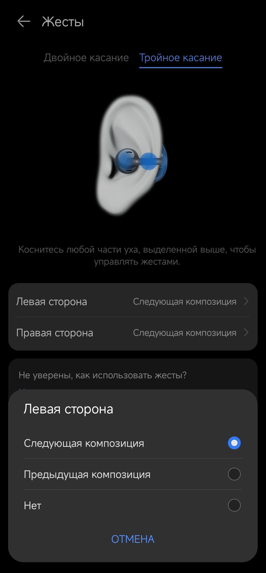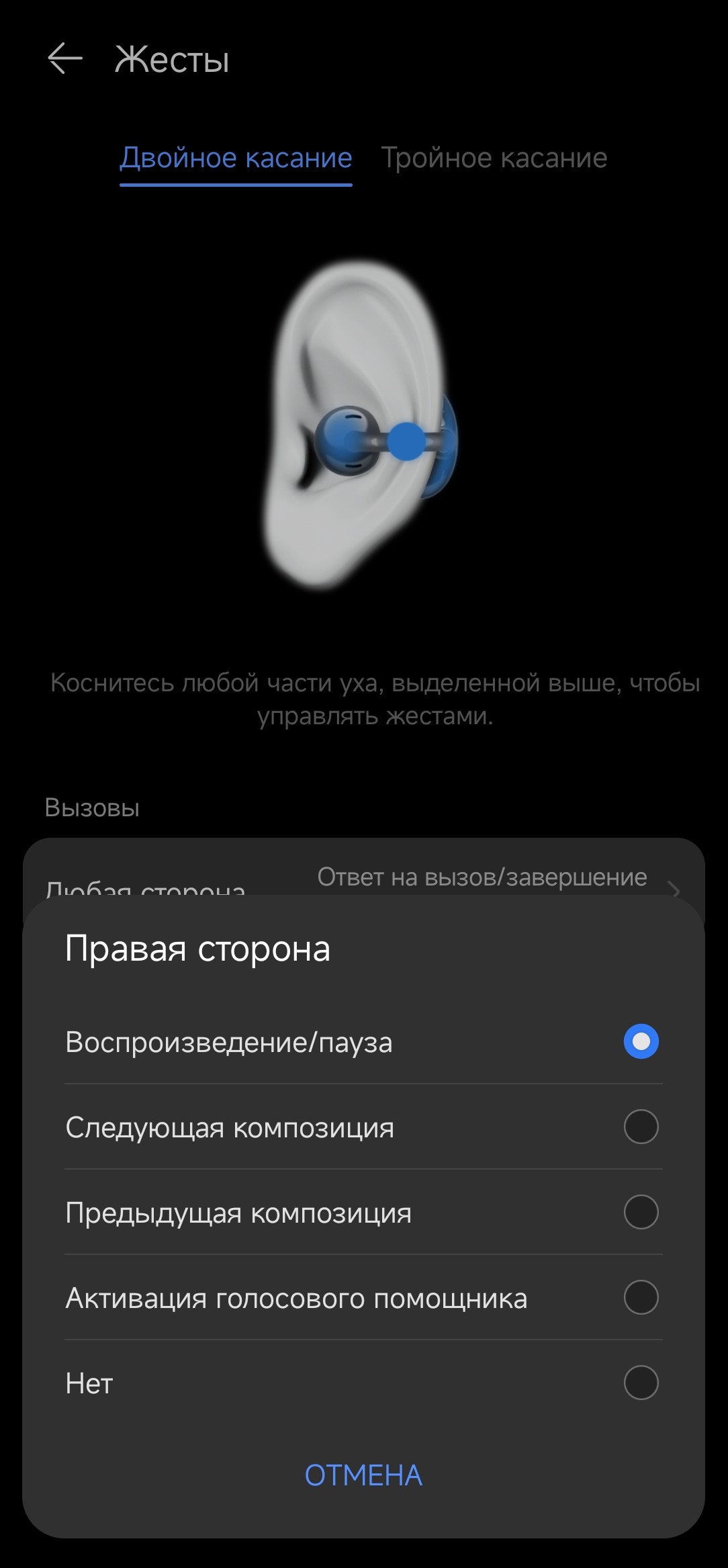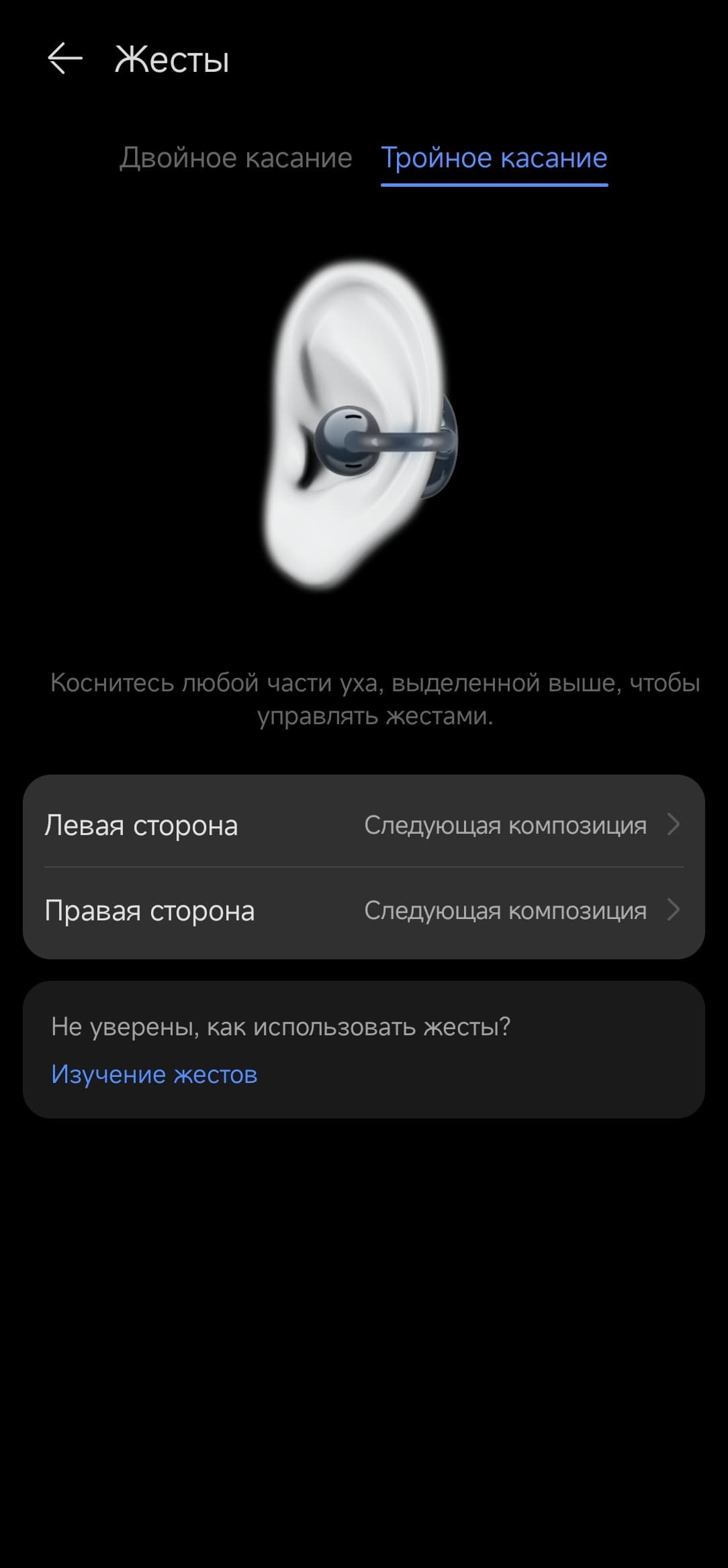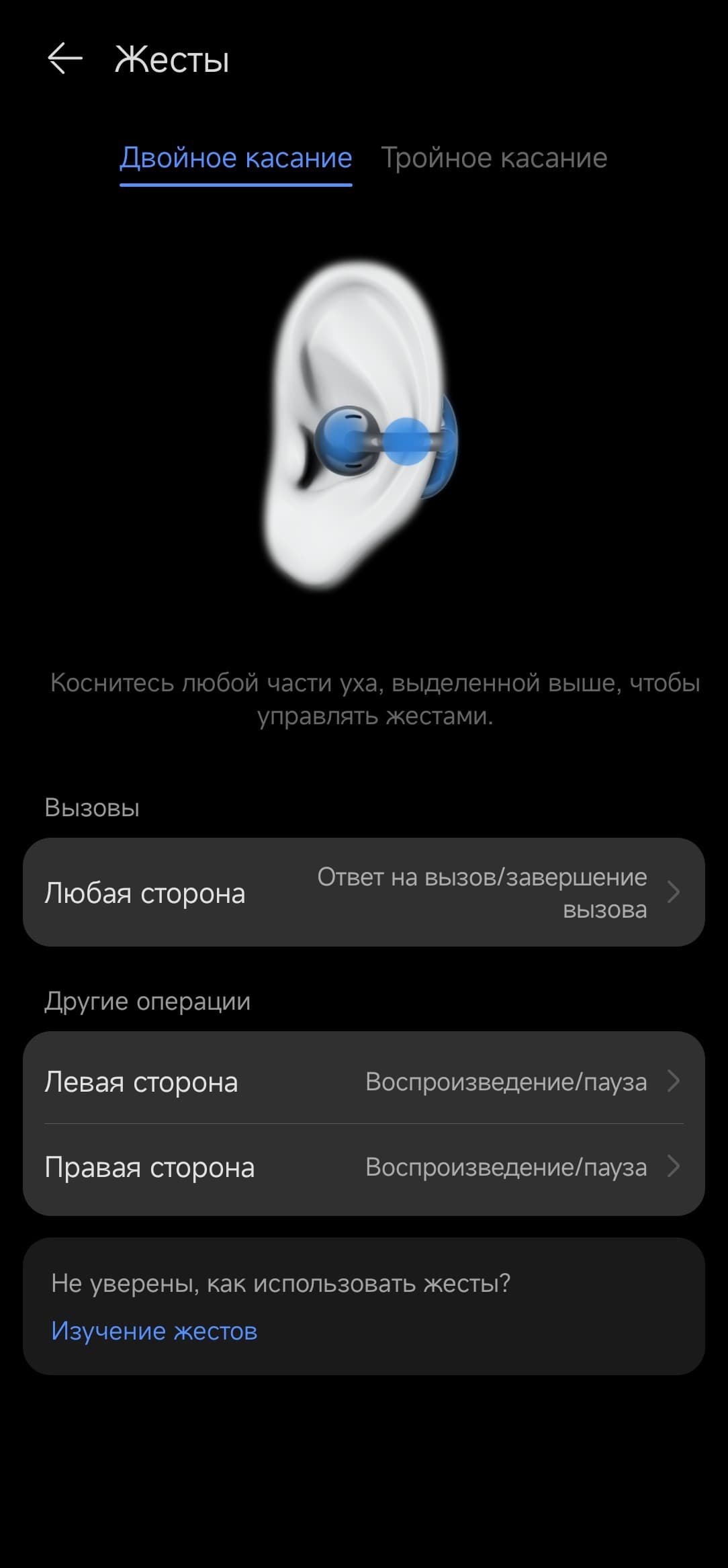 Двойной и тройной тап можно более-менее гибко настроить, при этом на правом и левом наушники один тип касания может отвечать за разные функции. Датчик ношения автоматически ставит музыку на паузу, если снять один из наушников, и снова запускает воспроизведение, как только он возвращается на ухо.