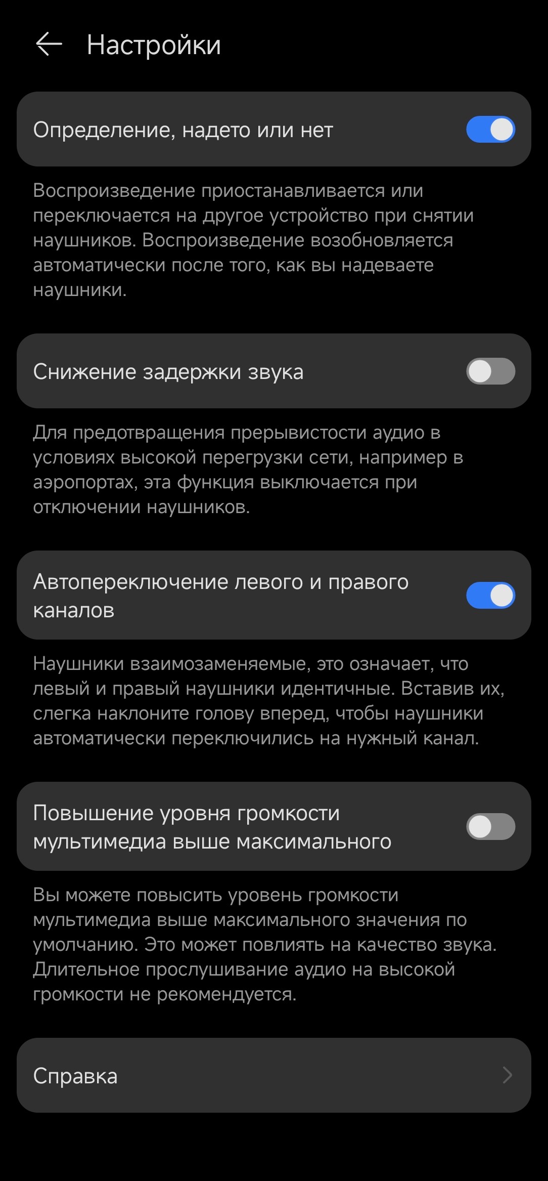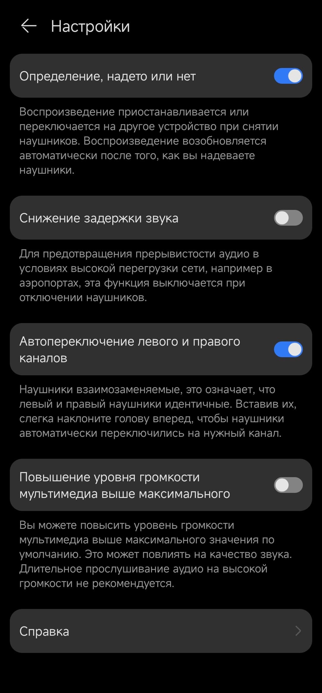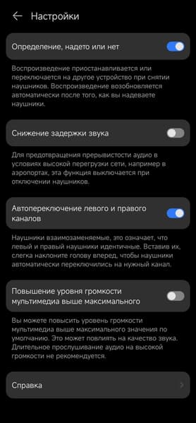 В секции настроек можно посмотреть информацию об устройстве, отключить датчики ношения и функцию автопереключения правого и левого каналов, а также повысить максимальный уровень громкости.