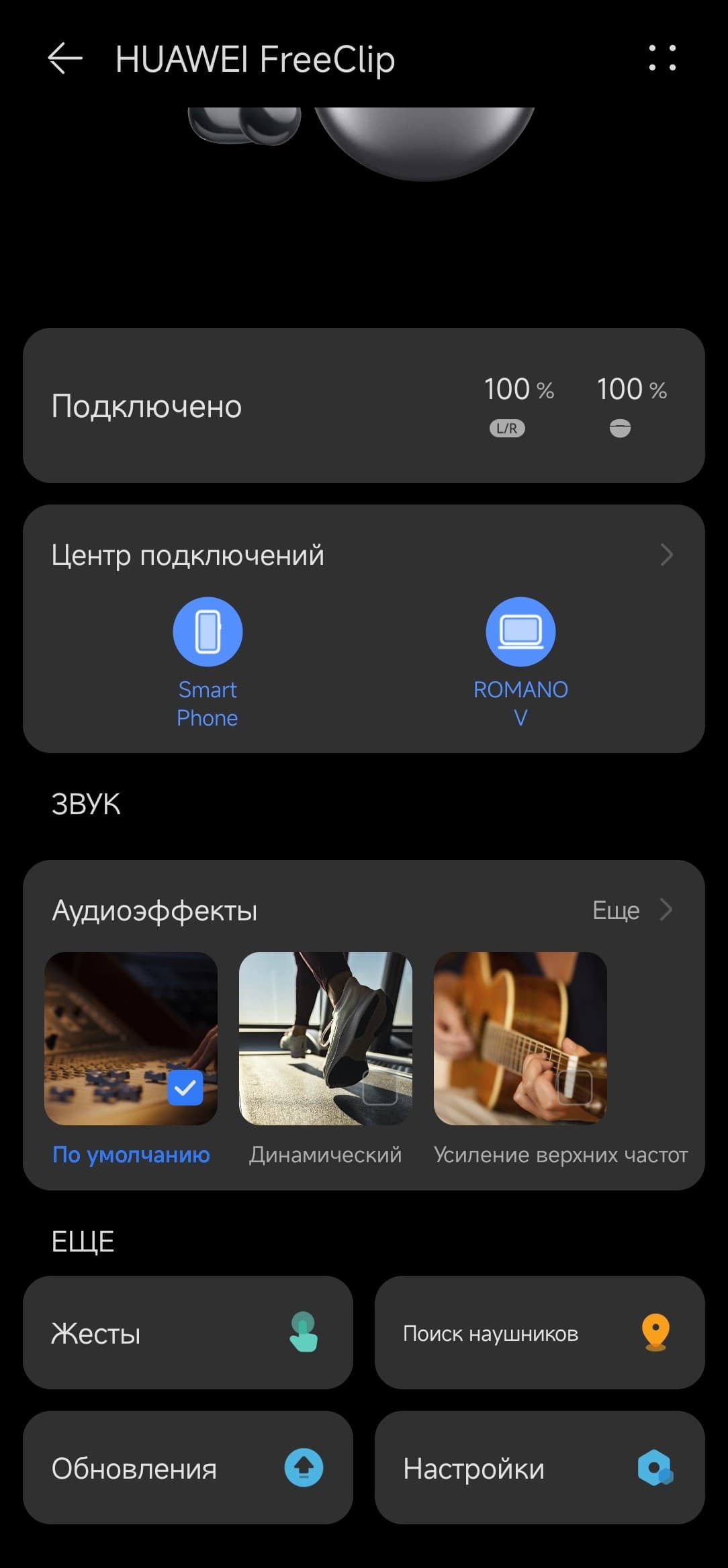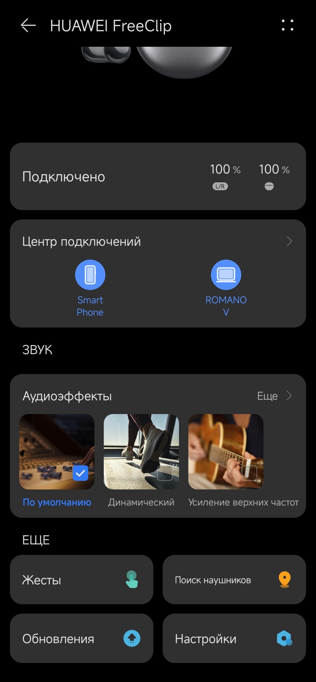 В разделе «Звук» можно выбрать один из четырех звуковых профилей. И вот тут, конечно, есть повод немного расстроиться — полноценного эквалайзера как, например, в уже упомянутых FreeBuds Pro 3 явно будет очень не хватать.
