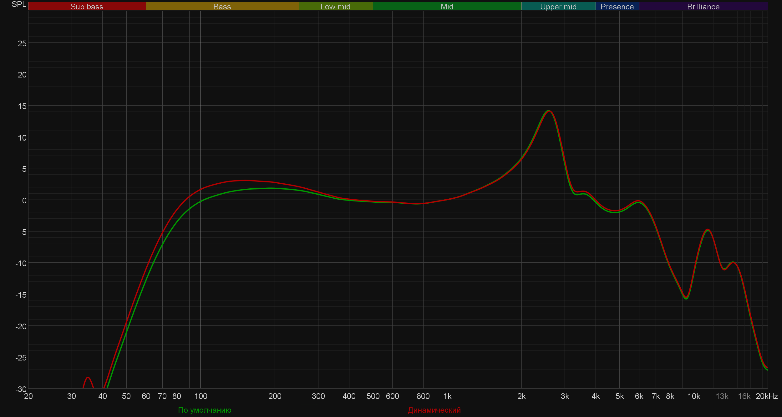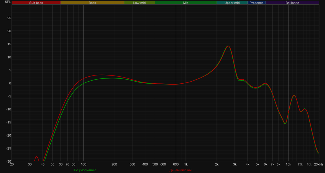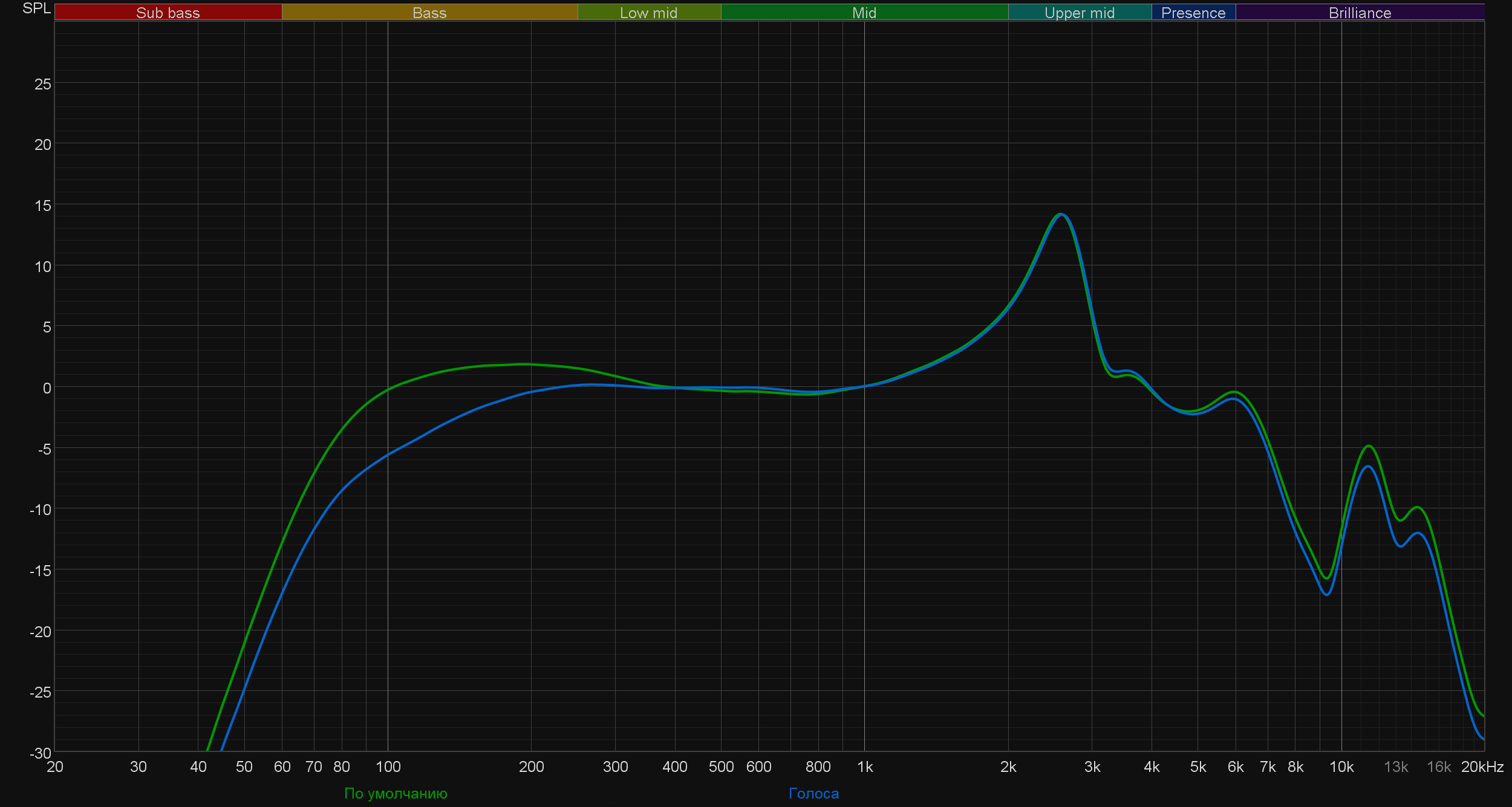 - «Голоса»: производитель предлагает использовать его для подчеркивания вокала и прослушивания подкастов, при его активации чуть выделяется СЧ-диапазон за счет увода назад баса и высоких частот