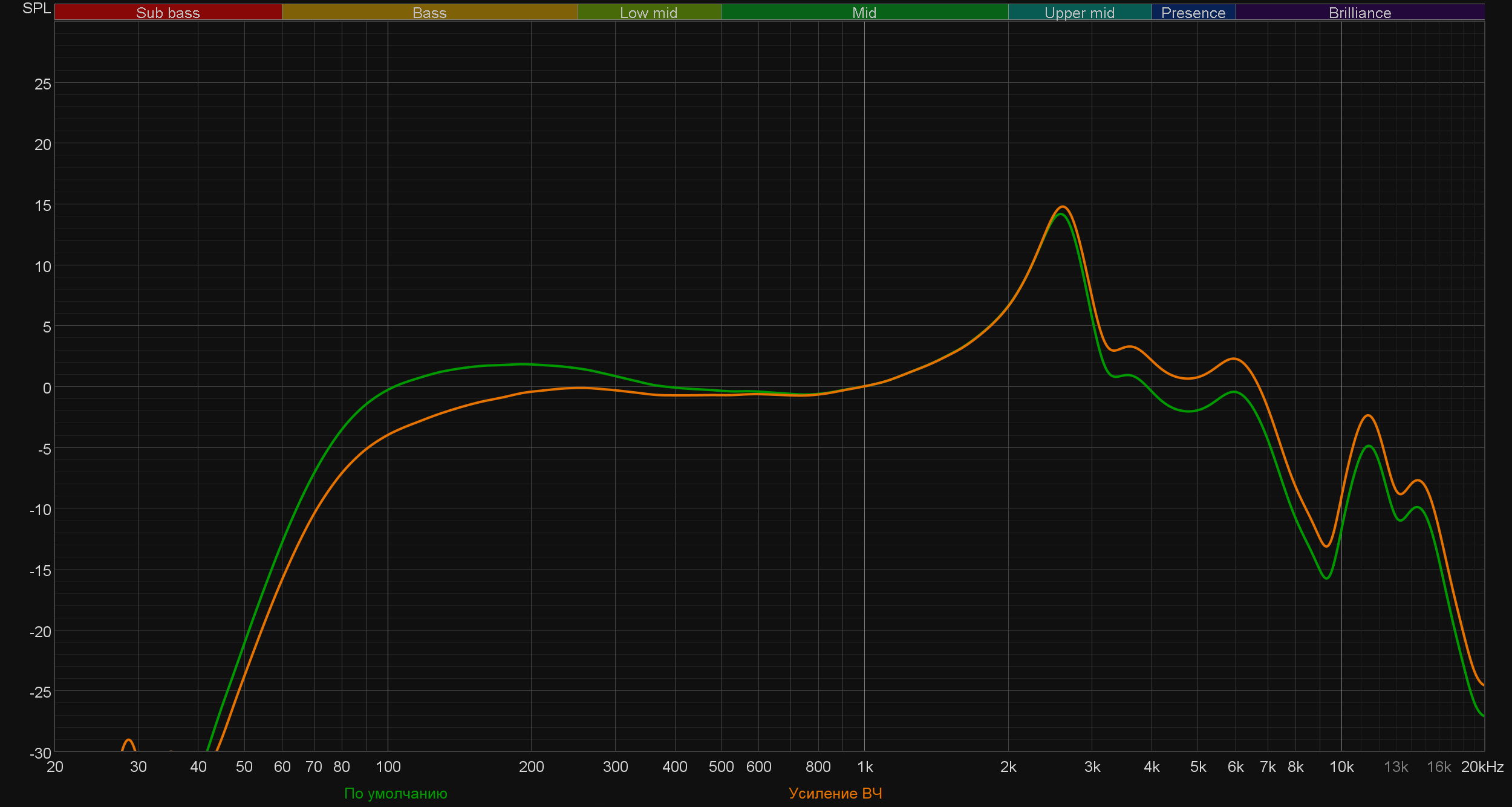 - «Усиление верхних частот»: верхние частоты получают дополнительный акцент, частично достигаемый за счет увода назад баса
