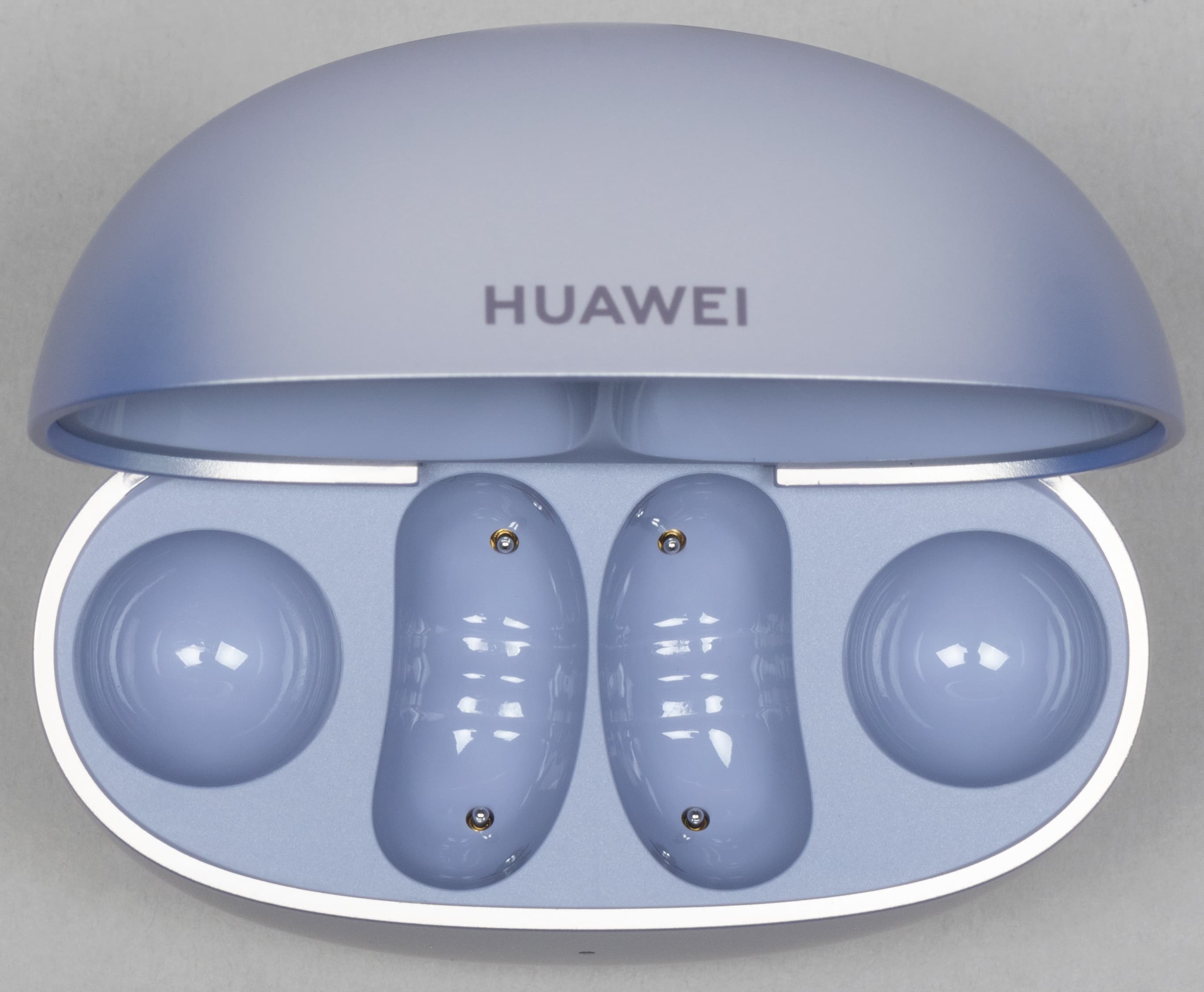 Во внутренней части углублений для фасолевидной части гарнитуры видны подпружиненные контакты для зарядки. Два элемента помещаются в отдельные части слота, соединяющий их дополнительно удерживается с помощью углубления в крышке. Всё это позволяет максимально плотно закрепить наушники в футляре: даже если специально потрясти его возле уха, внутри не слышно ни звука.
