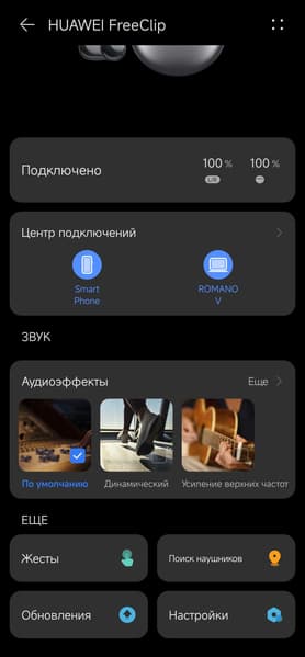 Смартфоны со свежими прошивками EMUI автоматически «находят» и предлагают подключить Huawei FreeClip сразу после открытия крышки кейса, то же самое неожиданно сделал ноутбук под управлением Windows 11. Также возможно подключение «классическим» способом — через меню мобильного устройства. После первого открытия крышки процесс сопряжения запускается автоматически, позднее его можно активировать с помощью кнопки на кейсе.
