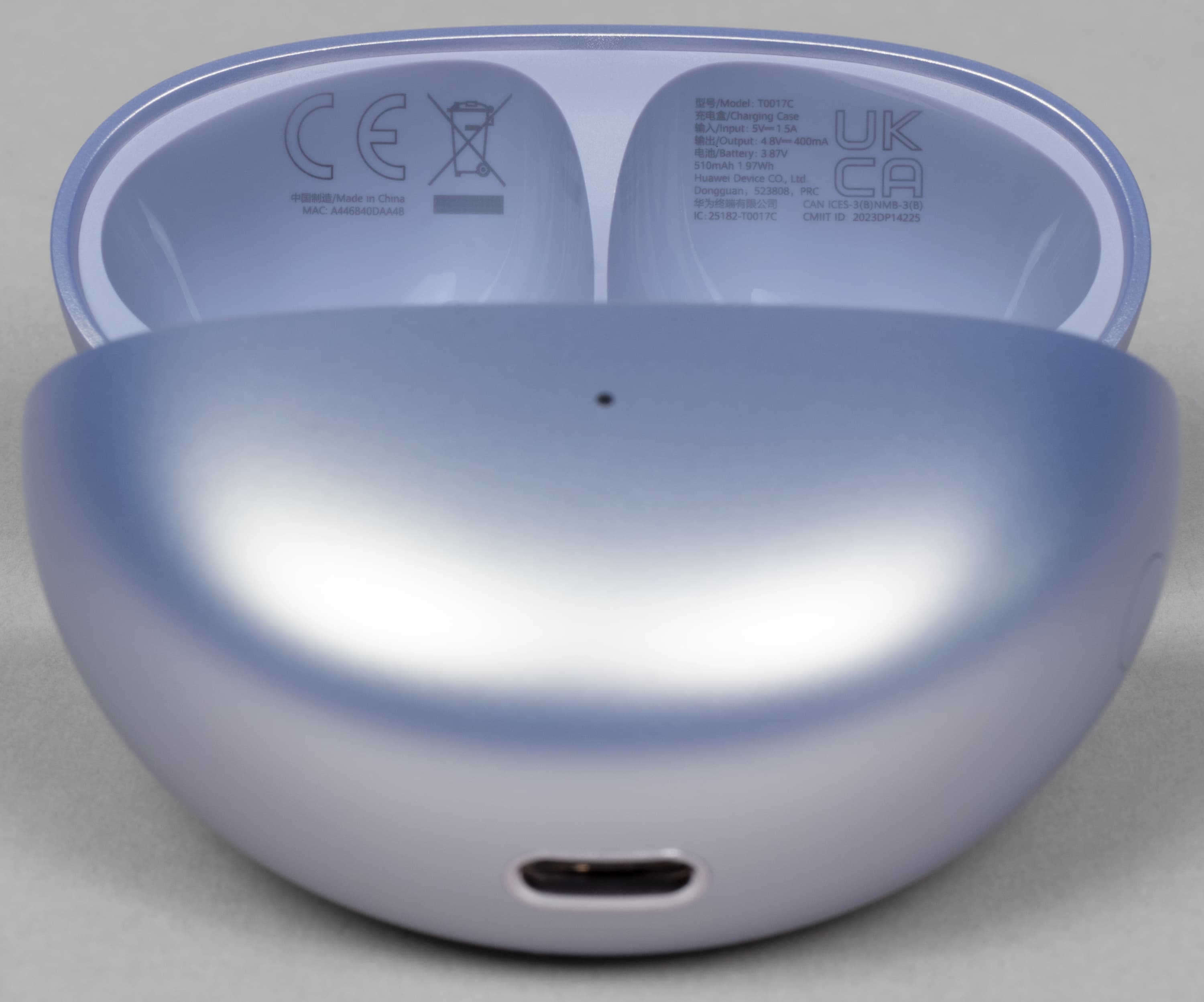 На внутреннюю сторону углублений в крышке нанесены краткая информация об устройстве и логотипы систем сертификации. На боковой поверхности видна кнопка запуска процесса сопряжения гарнитуры с устройством — источником звука.