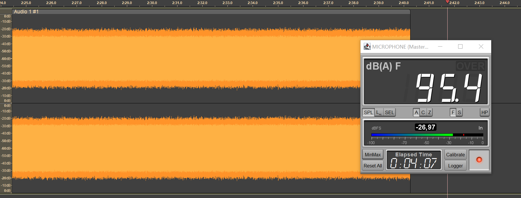 Безопасным уровнем звукового давления при прослушивании музыки считается 75 дБ, но на практике большинство слушателей предпочитает уровень 90-100 дБ. Мы транслируем в наушники белый шум, фиксируя уровень SPL в районе 95 дБ, сразу после старта воспроизведения запускаем запись сигнала с измерительного стенда — по длине получившегося трека легко понять, сколько проработал каждый из наушников.
