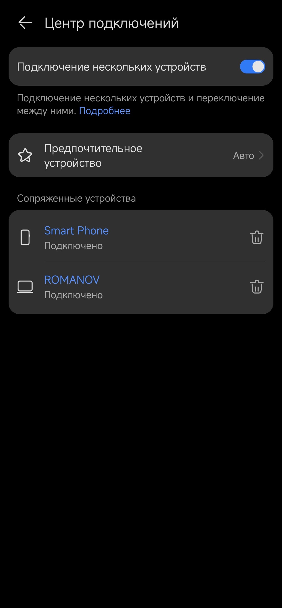 В «центре подключений» можно настроить работу мультипойнта — в частности, выбрать предпочитаемое устройство. Особых причин делать это вновь нет — в автоматическом режиме всё работает максимально корректно и удобно.