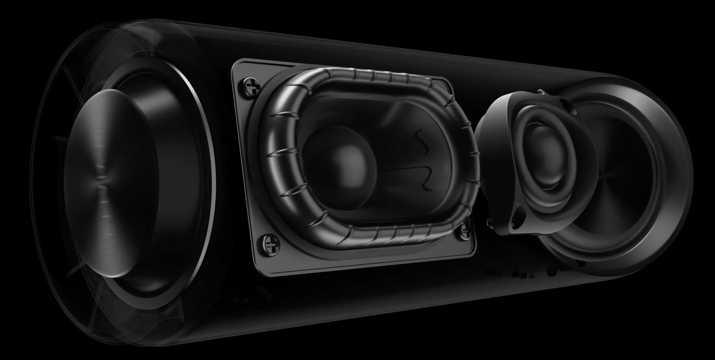 Как уже упоминалось во введении, внутри корпуса расположились широкополосный динамик размером 50×75 мм с диффузором из углеродного волокна, а также шелковый твитер диаметром 19 мм. Плюс два пассивных излучателя в торцах.