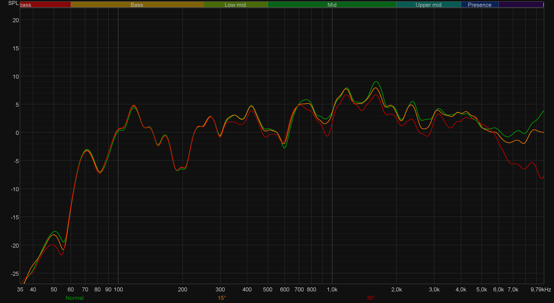 В общем, возможность подстроить звук под себя однозначно имеется, что радует. Мы же напоследок посмотрим на горизонтальную дисперсию звука и попробуем немного перемещать измерительный микрофон относительно передней плоскости колонки — примерно на 15 и 30 градусов. Очевидно, что качество передачи высокочастотного диапазона при этом страдает, но в рамках разумного — серьезно волноваться об этом явно не стоит.