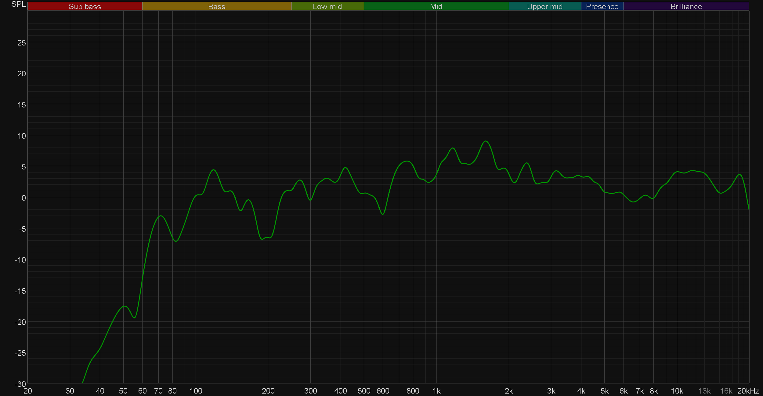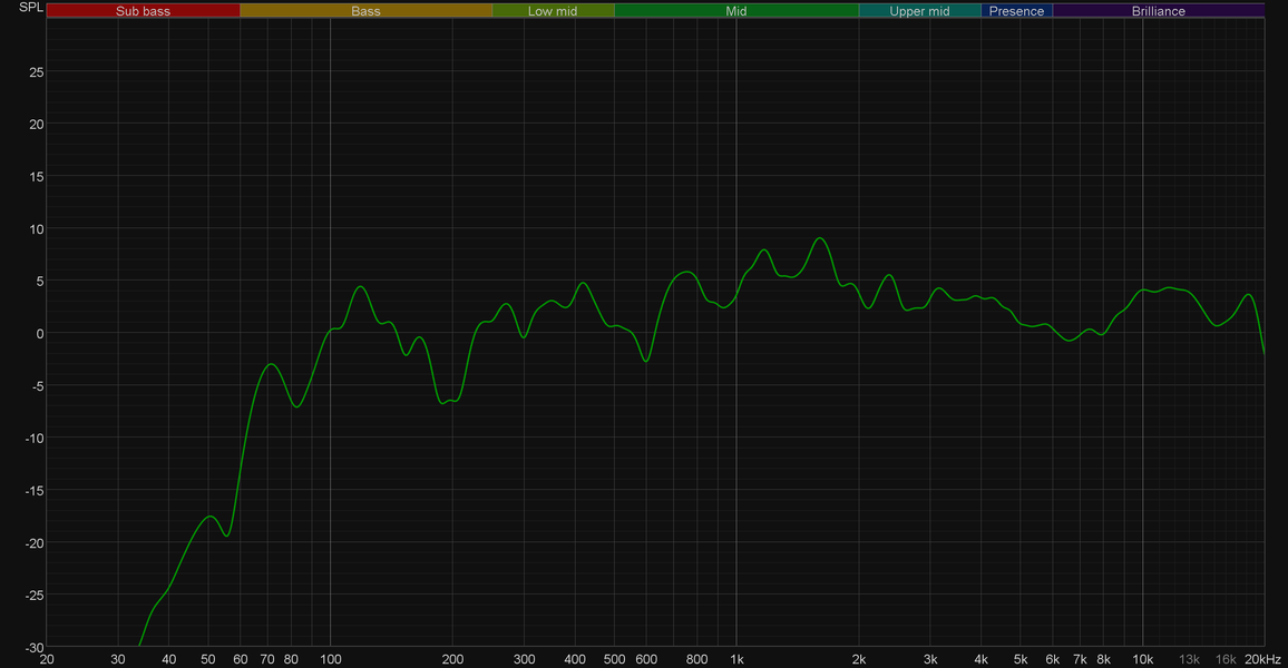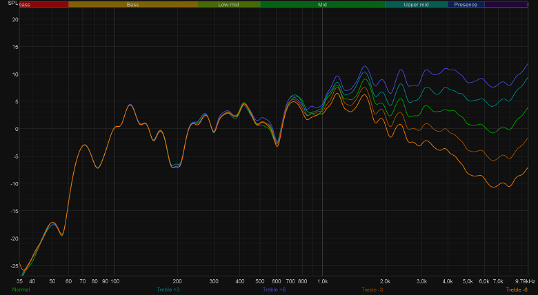 Видно, что работают регуляторы весьма эффективно: специфика звучания диапазона, конечно, не меняется, а вот акцентом на нем можно управлять в весьма широких пределах. Примерно то же самое происходит с высокими частотами при изменении значений регулятора Treble.