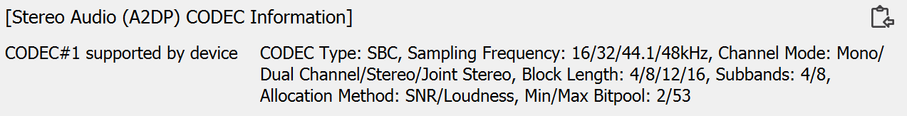 Список поддерживаемых кодеков мы традиционно получили с помощью утилиты Bluetooth Tweaker. Вернее, списка-то никакого и нет: кодек всего один — базовый SBC. И вот тут, конечно, немного жаль: уж как минимум AAC в подобном устройстве очень бы хотелось увидеть. Не говоря уже про HDMI или хотя бы оптический вход для совместного использования с телевизором.