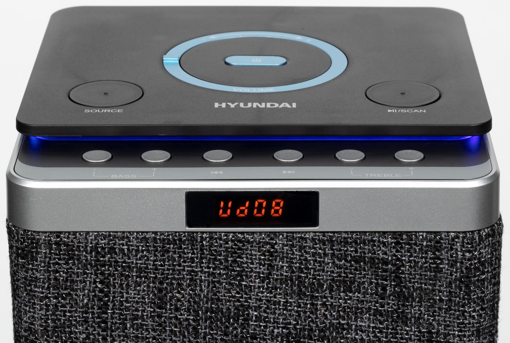 По центру верхней панели устройства размещена кнопка питания, вокруг нее находится довольно оригинальный регулятор громкости — кольцо с небольшим рычажком, представляющее собой валкодер с дискретным ходом без ограничения угла вращения. Ниже размещены две крупных кнопки: одна позволяет выбрать источник звука, вторая — управлять воспроизведением и запускать сканирование эфира в режиме радиоприемника. Ниже расположен ряд одинаковых кнопок, которые позволяют изменять настройки эквалайзера, а также пролистывать треки вперед и назад.